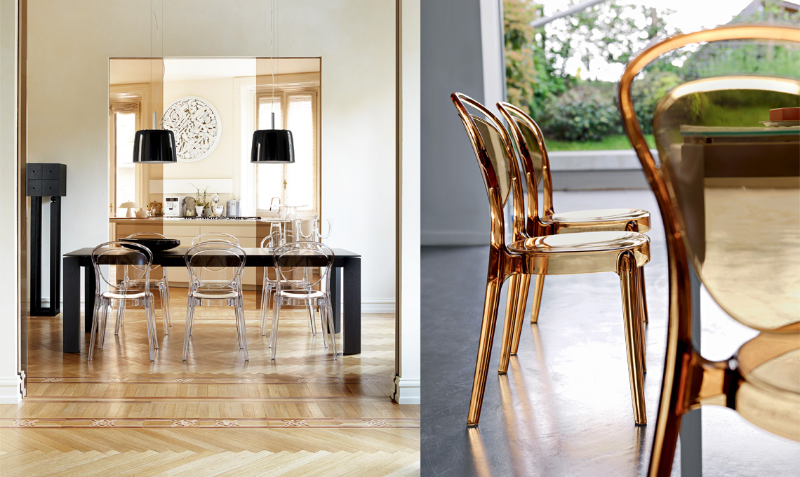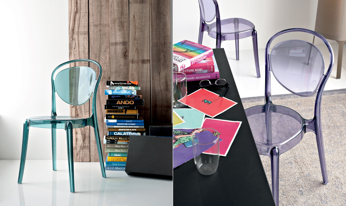 Le sedie Calligaris sono impilabili e possono essere riposte durante l'inverno, un peccato, però, data la bellezza delle linee. In policarbonato, la tipologia di plastica che regala l'effetto trasparente e liscio del vetro, ma ha il plus della resistenza, è la sedia Parisienne dalle forme curve e tondeggianti senza spigoli che rievoca lo stile morbido di una sedia d'antan. Trasparente nei colori rosso scuro, grigio fumè, ambra e neutro e coprente nei colori nero, bianco e rosso, si accorda con ogni tipo di arredo, rétro o contemporaneo.