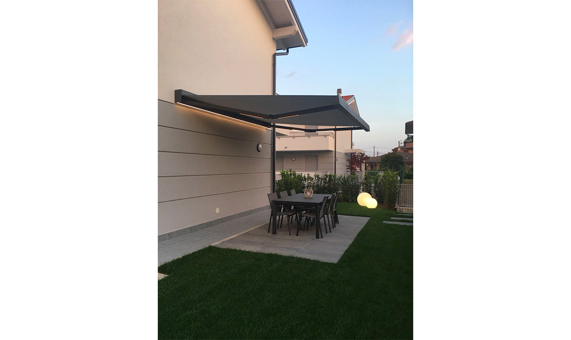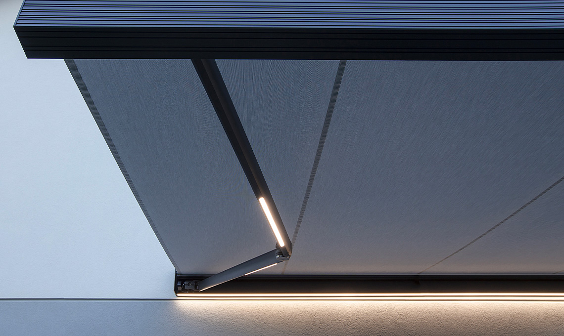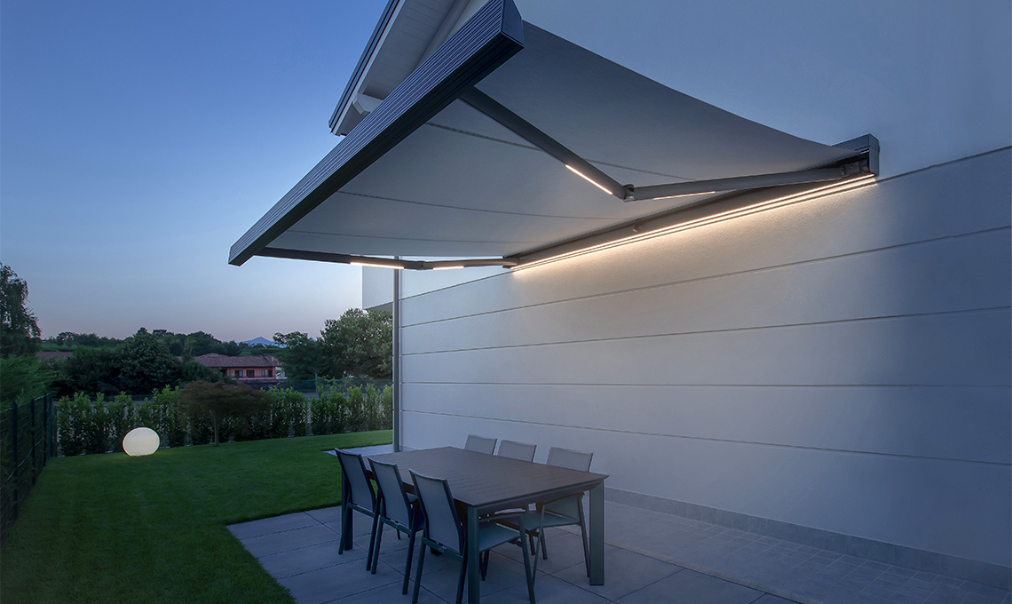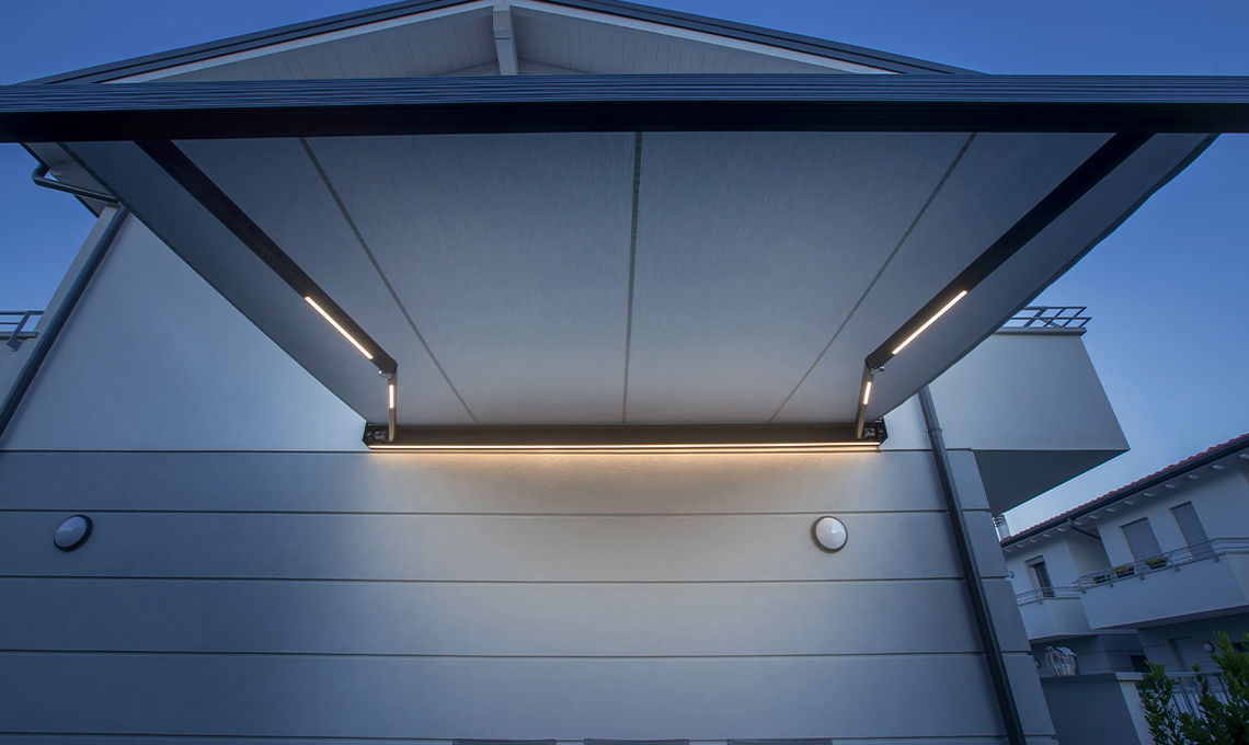 Ma non sono le uniche cose che scompaiono. L’armonia esterna si abbina alla tecnologia interna: grazie a un meccanismo – depositato – il cavo delle luci a LED viene integrato perfettamente all'interno del braccio e viene nascosto alla vista. Di sera le luci si accendono e illuminano i profili della tenda quasi per magia per lo stupore di tutti. La linea pulita si adatta perfettamente a ogni ambiente senza soluzione di continuità tra l’interno e l’esterno, permettendo a chi sosta di godere dell’outdoor con il comfort e l’estetica dell’indoor anche di sera, donando un tocco di leggerezza e spensieratezza anche alla propria casa.