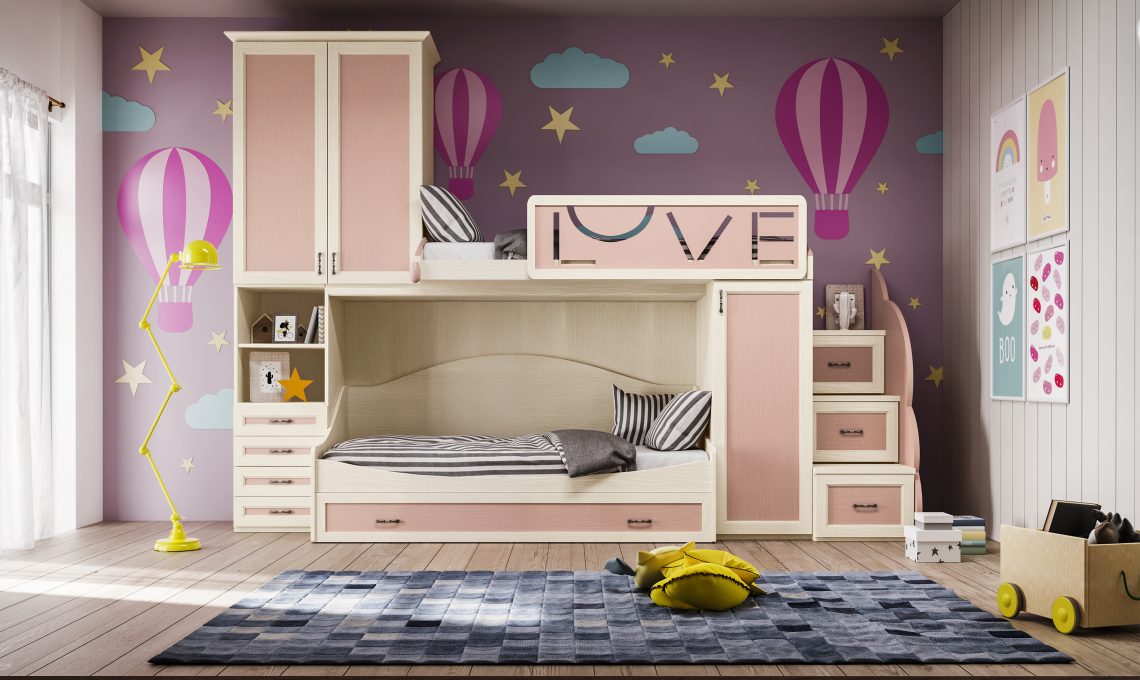 Cameretta linea Old in nobilitato Betulla e colore rosantico di dimensioni L352,8 H262 P96/58. A sinistra modulo armadio con 4 cassetti, due vani a giorno e due ante. Divano letto con due reti ortopediche, armadio con anta di dimensioni L50 H131,2 P91 e scala per accedere al letto superiore con tre cassettoni e protezione.