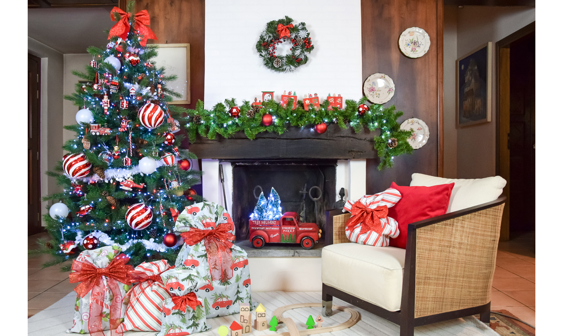 Quest’anno per noi sarà un Natale molto tradizionale da passare tutti insieme in famiglia. Tutto sarà dedicato a creare l’atmosfera più magica per incantare il mio bambino di un anno e mezzo. Passeremo il Natale dai nonni, per questo ho voluto decorare il loro soggiorno dove apriremo i regali e giocheremo tutti insieme. Per farlo ho scelto la collezione Magic di Leroy Merlin, dedicata alla tradizione, al gioco e alle fiabe. Un grande albero molto ricco, con tante luci e addobbi, è il protagonista della stanza. C’è da rimanere incantati osservando i dettagli delle decorazioni: macchinine, pacchetti regalo, renne, pupazzi di neve, schiaccianoci, palline di tutte le misure... I colori che ho scelto sono i più classici del Natale: il bianco e il rosso, in perfetto omaggio alla tradizione. Mi sono divertita anche a decorare il camino e il pianoforte, qui tra ghirlande e luci si è creata un’atmosfera molto calda e accogliente dove passeremo bellissimi momenti tutti insieme. Per trasformare un po’ la stanza ho persino ricoperto il camino con della carta da parati a mattoni bianchi, per dare al tutto un tocco un po’ più rustico. Ad accompagnarci nell’attesa del Natale ci penserà il trenino-calendario dell’Avvento che con tutti i suoi cassettini regalerà una mini sorpresa ogni giorno! L’idea in più: per sostituire la carta regalo ho realizzato dei sacchetti di varie dimensioni, utilizzando tessuto al metro con fantasie natalizie. In questo modo basterà chiuderli con dei fiocchi e si potranno utilizzare ancora e ancora! Non vedo l’ora di vedere lo stupore negli occhi di mio figlio e riscoprire insieme la magia del Natale.