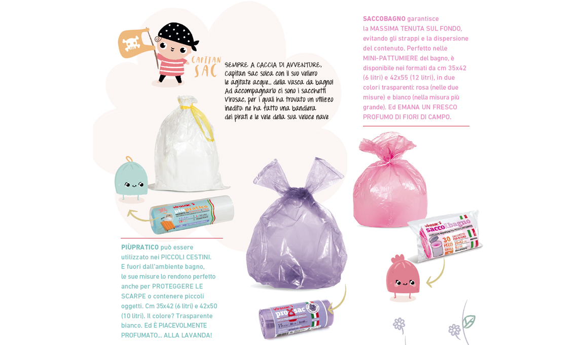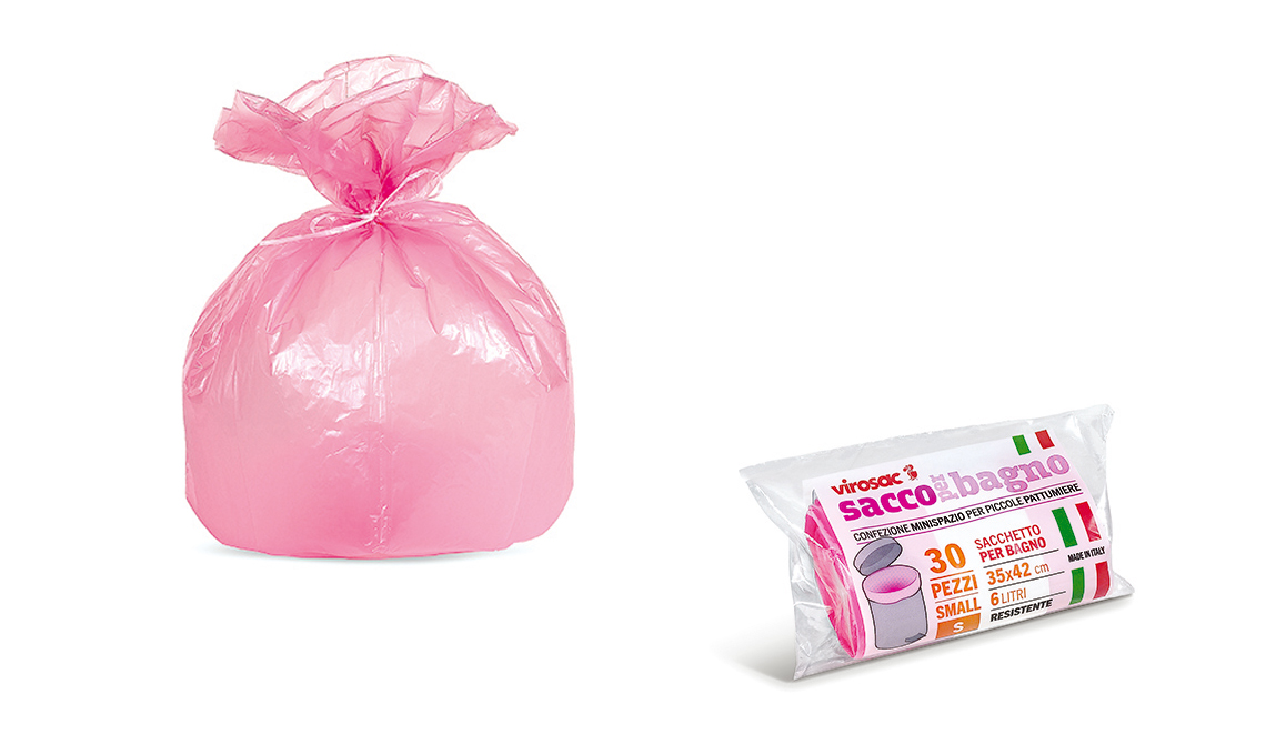SACCOBAGNO garantisce la massima tenuta sul fondo, evitando gli strappi e la dispersione del contenuto. Perfetto nelle mini-pattumiere del bagno, è disponibile nei formati da cm 35x42 (6 litri) e 42x55 (12 litri), in due colori trasparenti: rosa (nelle due misure) e bianco (nella misura più grande). Ed emana un fresco profumo di fiori di campo.