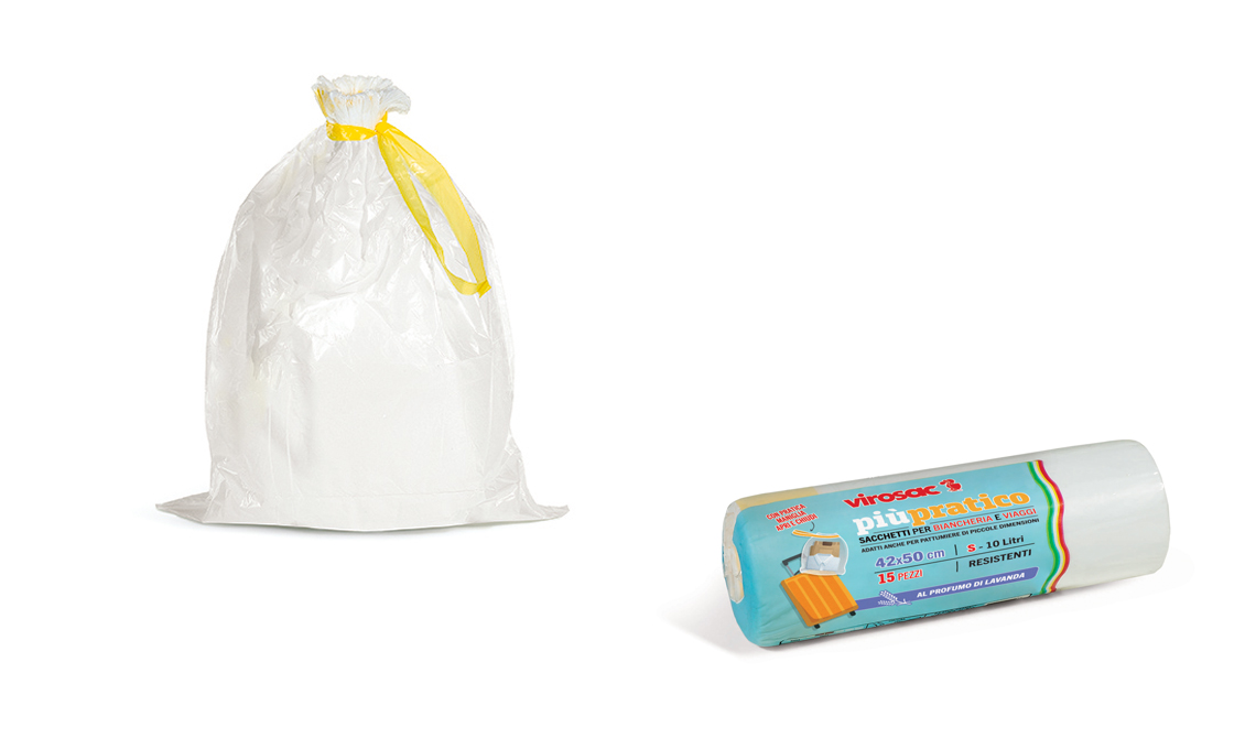 PIÙPRATICO può essere utilizzato nei piccoli cestini. E fuori dall’ambiente bagno, le sue misure lo rendono perfetto anche per proteggere le scarpe o contenere piccoli oggetti. Cm 35x42 (6 litri) e 42x50 (10 litri). Il colore? Trasparente bianco. Ed è piacevolmente profumato... alla lavanda!