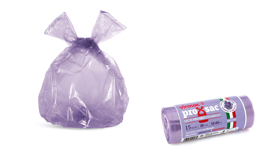 PROXSAC con le pratiche bretelle per un agevole cambio e trasporto dei rifiuti, è composto all’80% di plastica riciclata ed è dotato di manici per trasformarsi in una pratica shopper. Da cm 52x60 e 52x65 (30 litri). In tanti colori e profumazioni: lavanda, arancio, pino, borotalco, sandalo e vaniglia, melone e bergamotto.