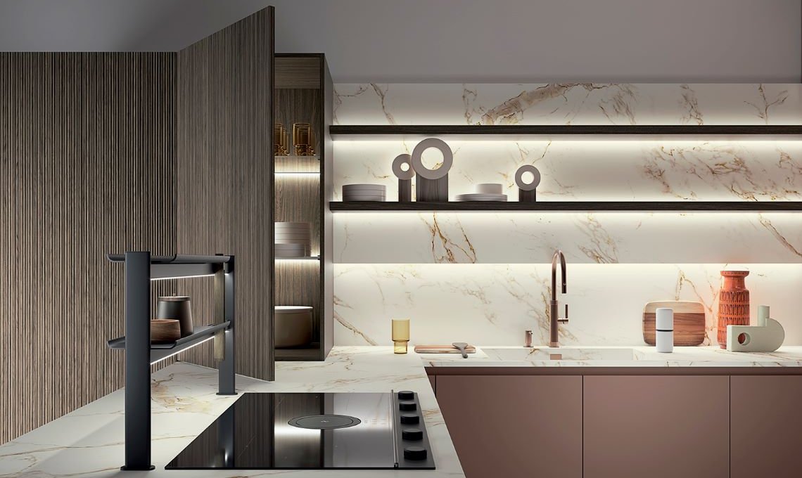 Non si tratta solo di numeri: queste soluzioni migliorano la postura durante l’uso, aumentano la superficie di lavoro e offrono maggiore capienza per stoviglie, provviste e accessori. La modularità Space è disponibile per le collezioni Sky, Up Design, Fly Evo/Flo Evo e I Naturali, garantendo libertà compositiva e continuità estetica, sia in ambienti minimal che più tradizionali.