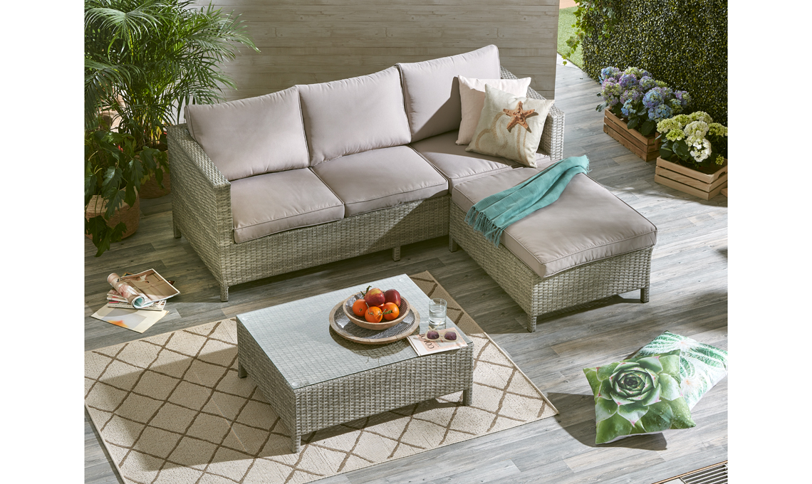 Chi cerca una soluzione salotto può orientarsi su Japan, di ispirazione orientale, con il grande divano angolare imbottito con struttura in alluminio e polywood e il tavolino basso coordinato; su Haiti, che fa pensare subito ai tropici, con il divano, il pouf e il tavolino in rattan sintetico grigio; oppure sul set Lara, con struttura in alluminio composto da un divanetto di due posti, due poltrone e tavolino.