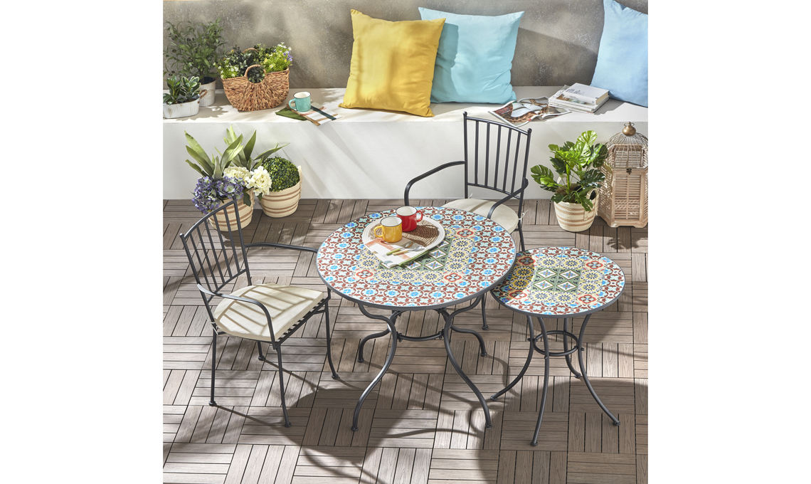 Il set Twice in legno di acacia color teak è la scelta perfetta per gli spazi più intimi: l'ingombro ridotto rende questo set perfetto anche su un balcone. Tavolo e sedie sono inoltre pieghevoli e ti permettono quindi di liberare facilmente lo spazio, quando non in uso. Il tavolo Ginger ha invece il top in mosaico, ispirato alle maioliche mediterranee, e si può abbinare alle sedie Lina con braccioli, struttura in ferro con cuscino incluso.