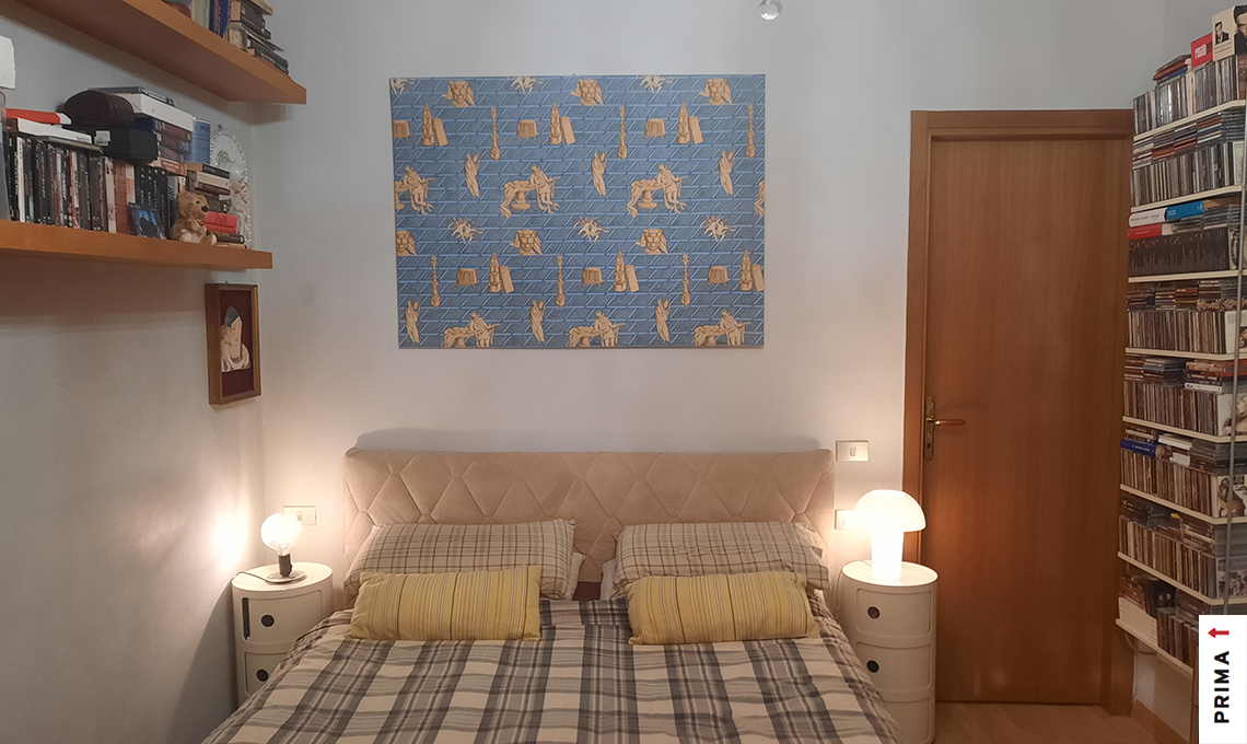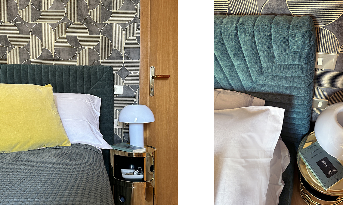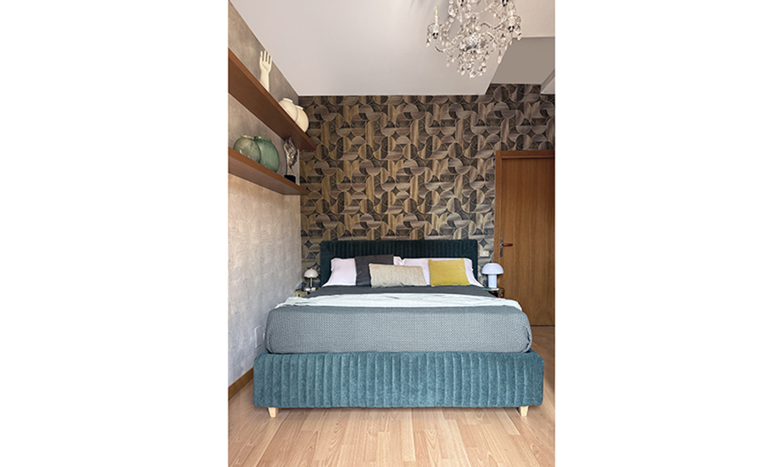 Siamo partiti dal letto, il focus del progetto. Claudio aveva già qualche idea, ma abbiamo preferito andare nel negozio Perdormire più vicino per toccare con mano le opzioni disponibili: il letto Maestrale, disegnato da Philippe Tabet per la collezione DDI (Design Democratico Italiano) di Perdormire, aveva tutte le caratteristiche desiderate: la testata imbottita con un gioco di cuciture che prosegue anche sul giroletto, materiale morbido e accogliente, grafica geometrica... Visto, scelto!