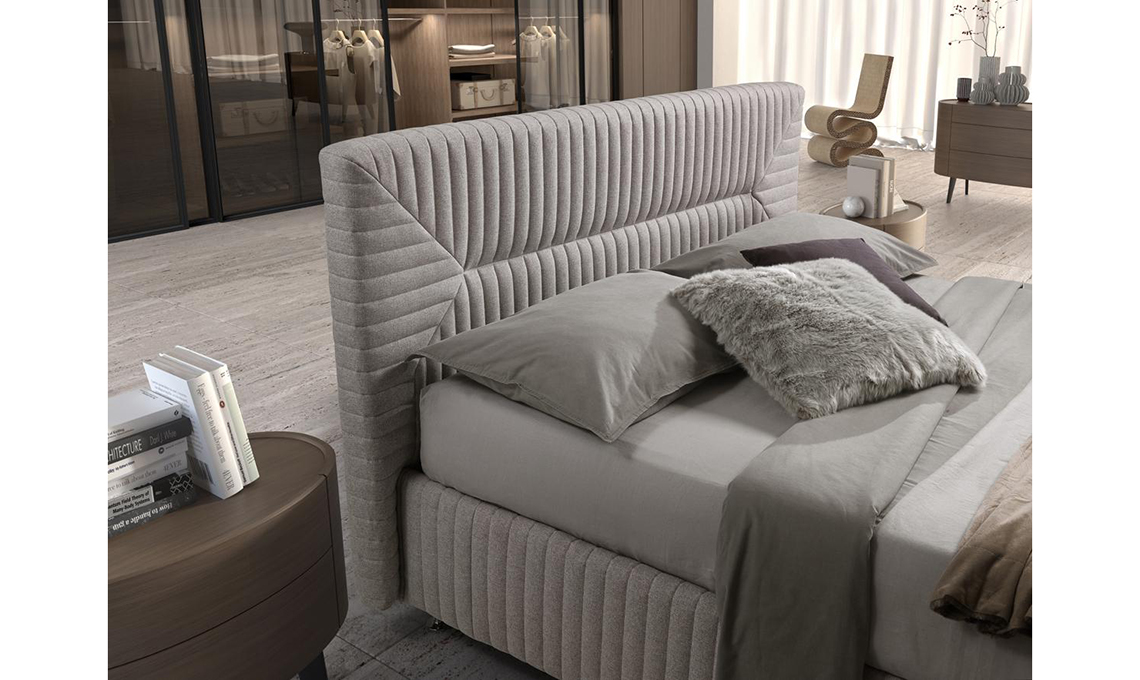Il letto Maestrale ha un comodo contenitore sotto il materasso. La testata imbottita è caratterizzata da un gioco di cuciture che prosegue anche sul giroletto. Il design sottolinea il contrasto tra la morbidezza del materiale e la geometria dei disegni, definendo e impreziosendo il rivestimento. La rete a doghe è inclusa nel prezzo e il sollevamento del contenitore a compasso è di serie. Claudio ha preferito la versione optional con sollevamento con messa in piano.