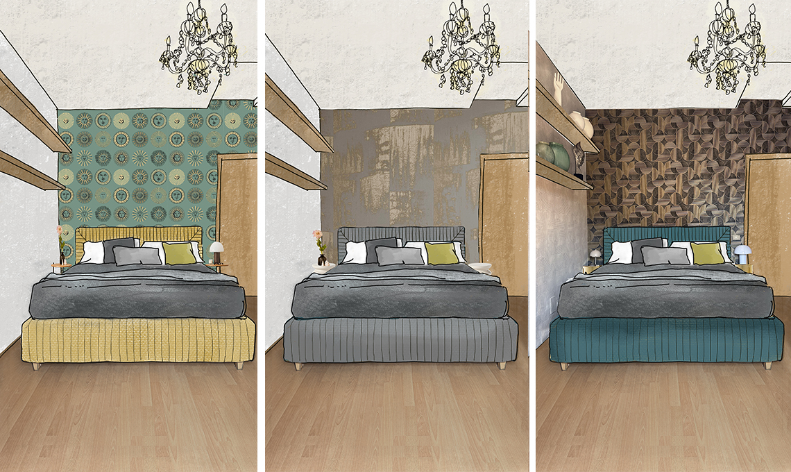 Ecco le 3 moodboard che ho proposto a Claudio: tre stili diversi sempre con il letto Maestrale di Perdormire come protagonista! I rivestimenti qui proposti sono, da sinistra a destra, Martina 08, Roma fumo 23 e Maia verde 13.
