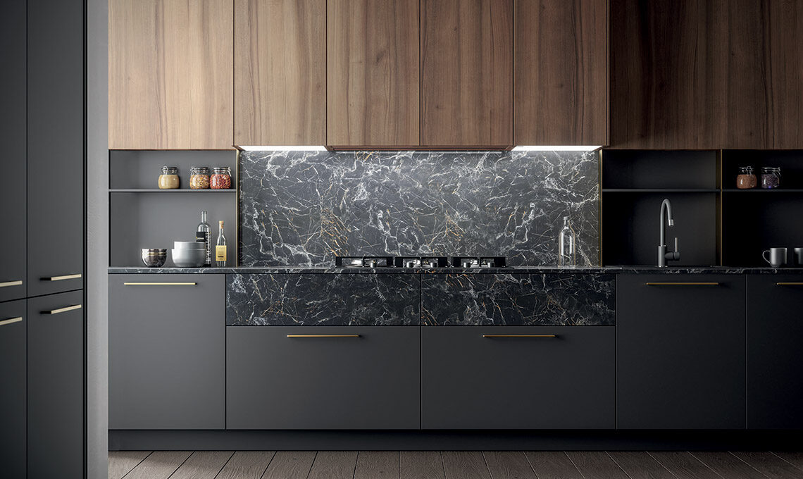 Kalì, composizione lineare con basi e colonne Pet maximatt opaco lavagna, maniglia 1180 finitura ottone, top e schienale Unicolor laminato pietra nera, cassetti h24cm pietra nera con apertura push pull; pensili e pannelli in laminato noce America.