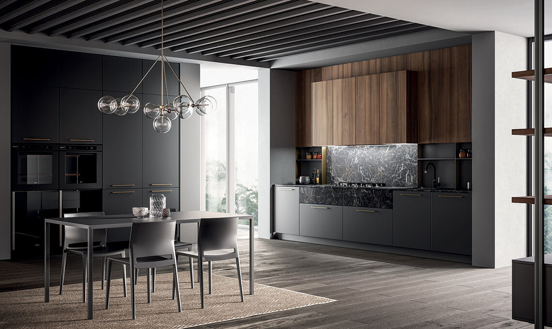 La cucina si sviluppa lungo la parete dominata dalla zona cottura che spezza il ritmo della composizione attraverso un dinamico gioco di altezze e di profondità. Il top e lo schienale in laminato Unicolor pietra nera si fondono con i cassetti che, grazie alla speciale altezza di 24 centimetri e alla finitura in continuità, creano un semplice ma lussuoso effetto monoblocco. I pensili in noce America sporgono dalla pannellatura, nella stessa finitura che ricopre la parete fino al soffitto, enfatizzando la centralità della zona cottura e rendendo questa cucina unica e distintiva. A completare, le basi e le colonne in Pet maxximatt lavagna opaco richiamano i moduli della libreria Free che, fissata al soffitto, separa delicatamente l’ambiente cucina dalla zona living, arredata in continuità grazie alle stesse finiture.