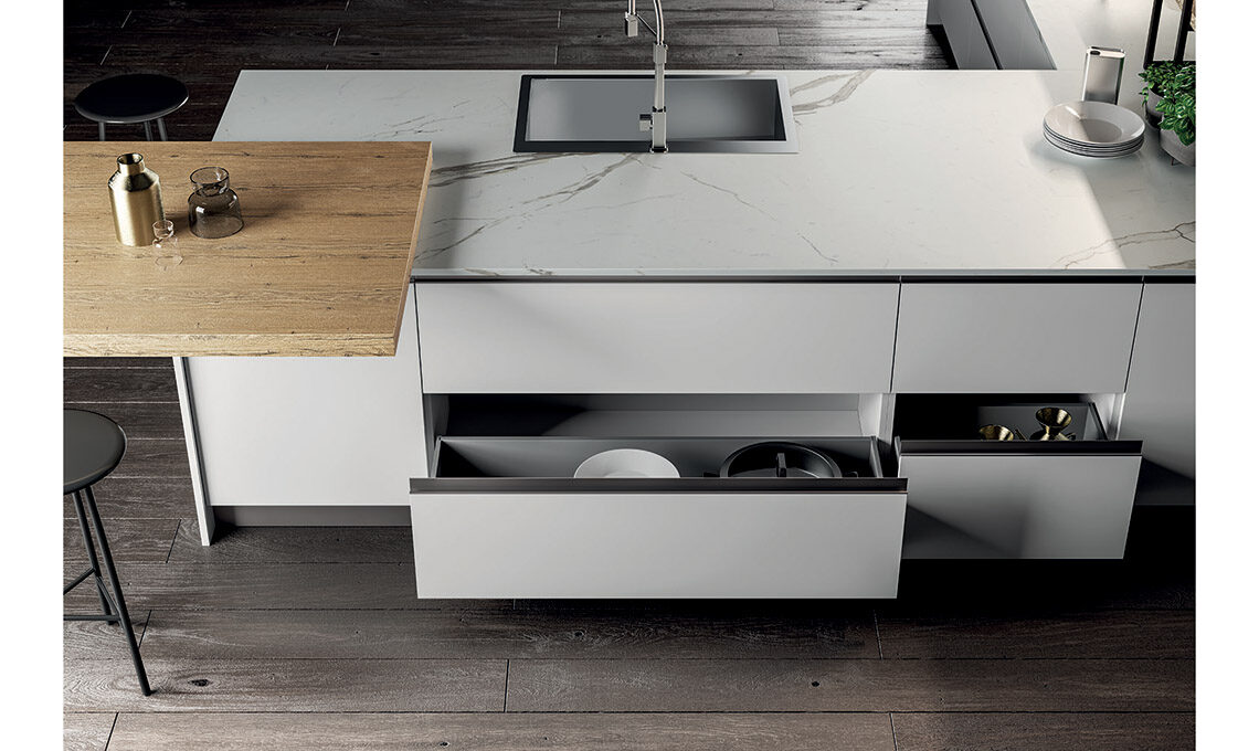 Linee pulite e materiali versatili consentono a Kalì di arredare in modo completo dall’ambiente cucina alla zona living.