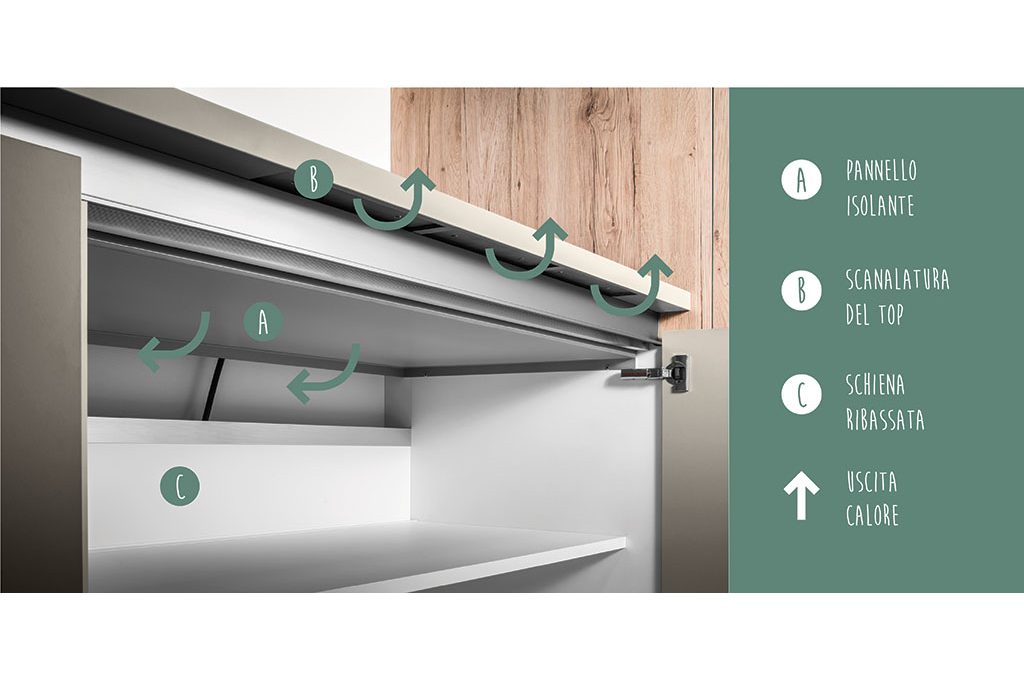 Questa soluzione viene associata ad una particolare lavorazione presente sui top (sia su quelli in laminato che su quelli in quarzo) che permette di mantenere un’aerazione sufficiente in tutta la zona.