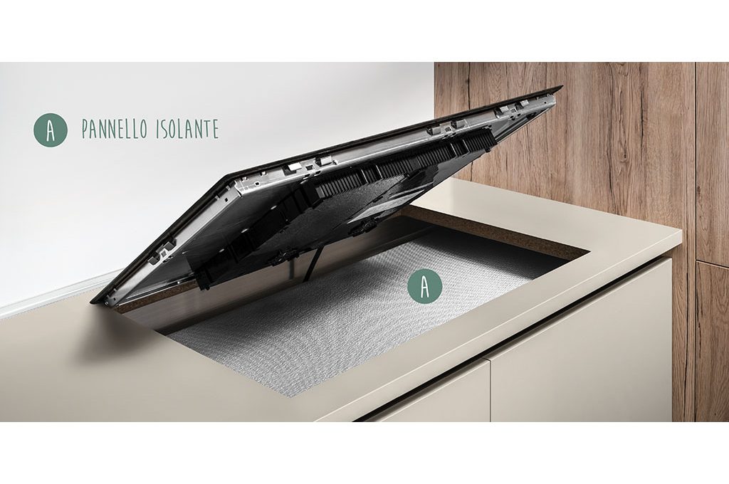 Per ovviare al problema del calore che si sviluppa sotto al piano ad induzione, Veneta Cucine inserisce un pannello isolante che funge da schermo.