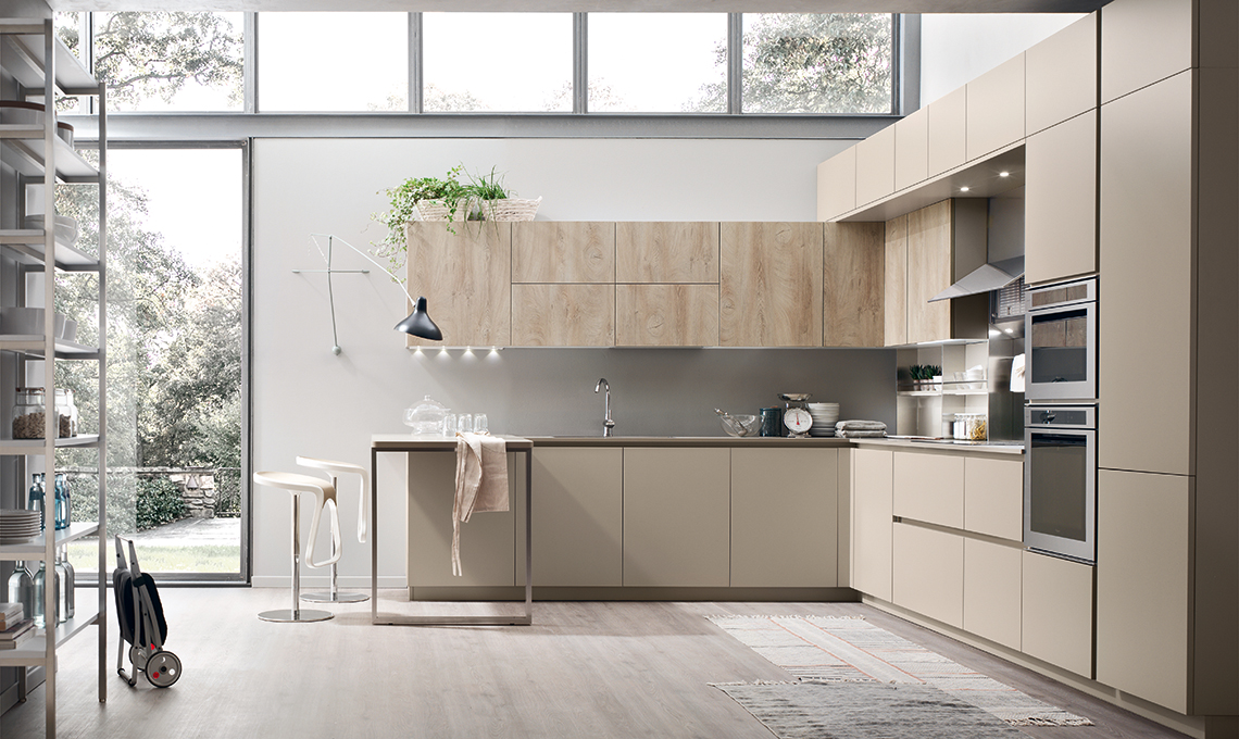Modello Lounge. Laccato opaco Beige Ecru con pensili Oyster Decorativo Tiglio Silver. L’atmosfera si ispira a quella tipica dei paesi del Nord, fatta di tinte chiare e calde abbinate al legno