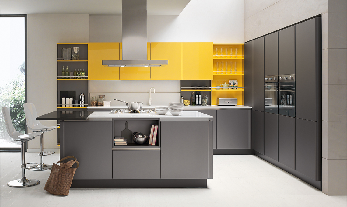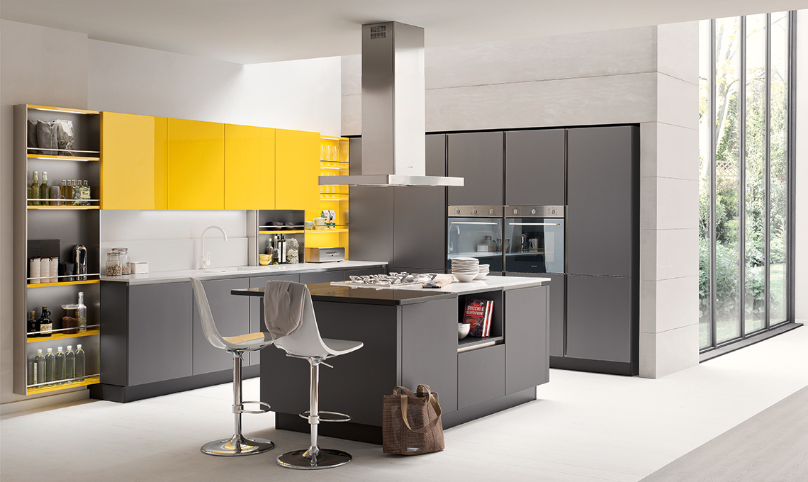 Modello Lounge. Laccato opaco Beige Ecru con pensili laccato lucido Giallo Girasole. Un tocco di pennello giallo per vivacizzare la stanza di un open space.
