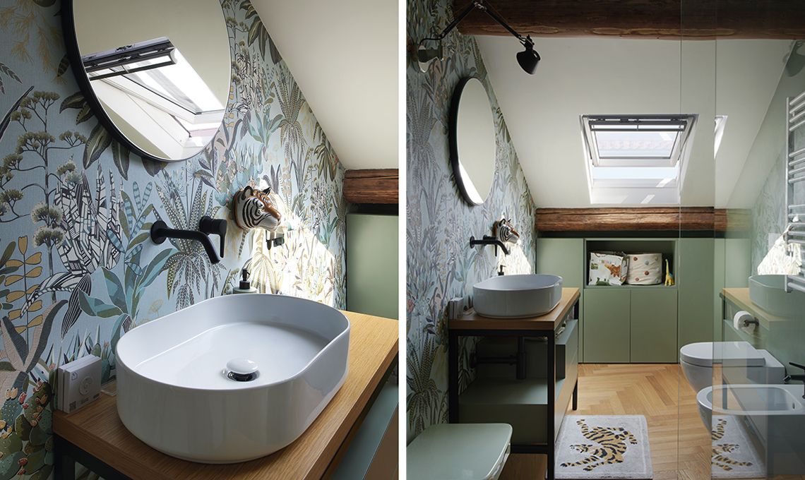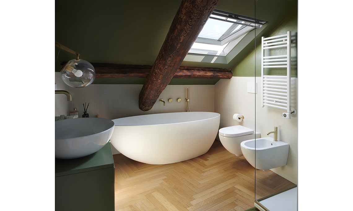 C'è un altro colore oltre al verde che disegna gli spazi: è il legno delle travi che è stato riportato al naturale e gioca a contrasto con il bianco delle pareti. Tutta questa casa parla di luce, ma le grandi aperture al cielo non devono far pensare all'equazione luce = caldo estivo = freddo invernale. La ristrutturazione ha aumentato l'efficienza energetica: i lucernari sono stati tutti sostituiti (e spesso ingranditi) con finestre per tetti di ultima generazione con tripli vetri isolanti che bloccano il calore all'esterno, a tutto vantaggio dei costi di riscaldamento e di raffrescamento.