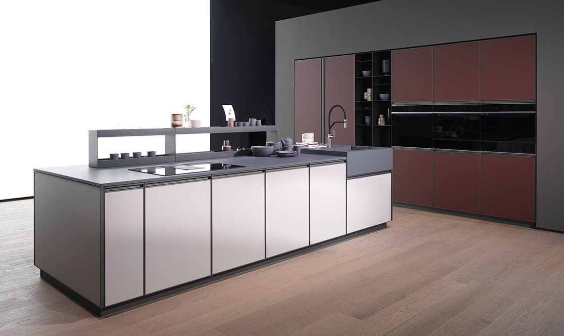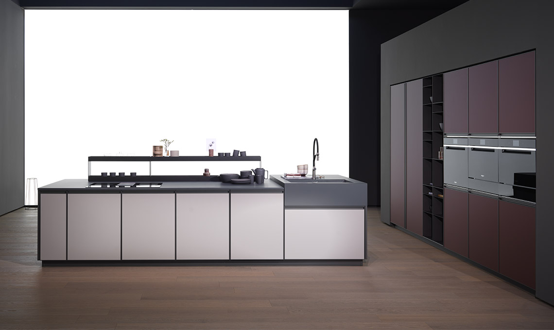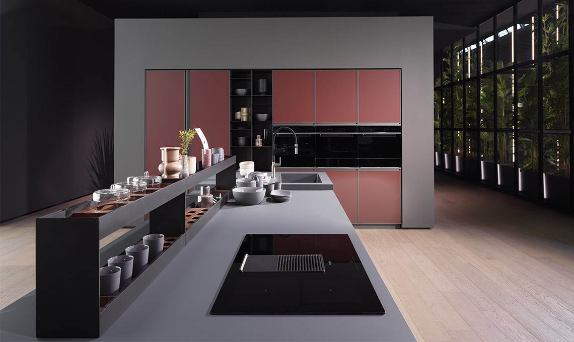 Una proposta unisce la zona cottura e la zona lavabo senza soluzione di continuità in un unico volume centrale realizzato con top in HPL Fenix grigio bromo e la struttura in grigio orion; le ante risultano esteticamente leggere grazie al telaio in alluminio verniciato titanio, mentre le maniglie si integrano all’anta bianca scomparendo come linee sottili. Deciso il colore delle ampie colonne in Fenix che fungono da dispensa, capaci di nascondere accessori ed elettrodomestici dietro il rosso Japur.