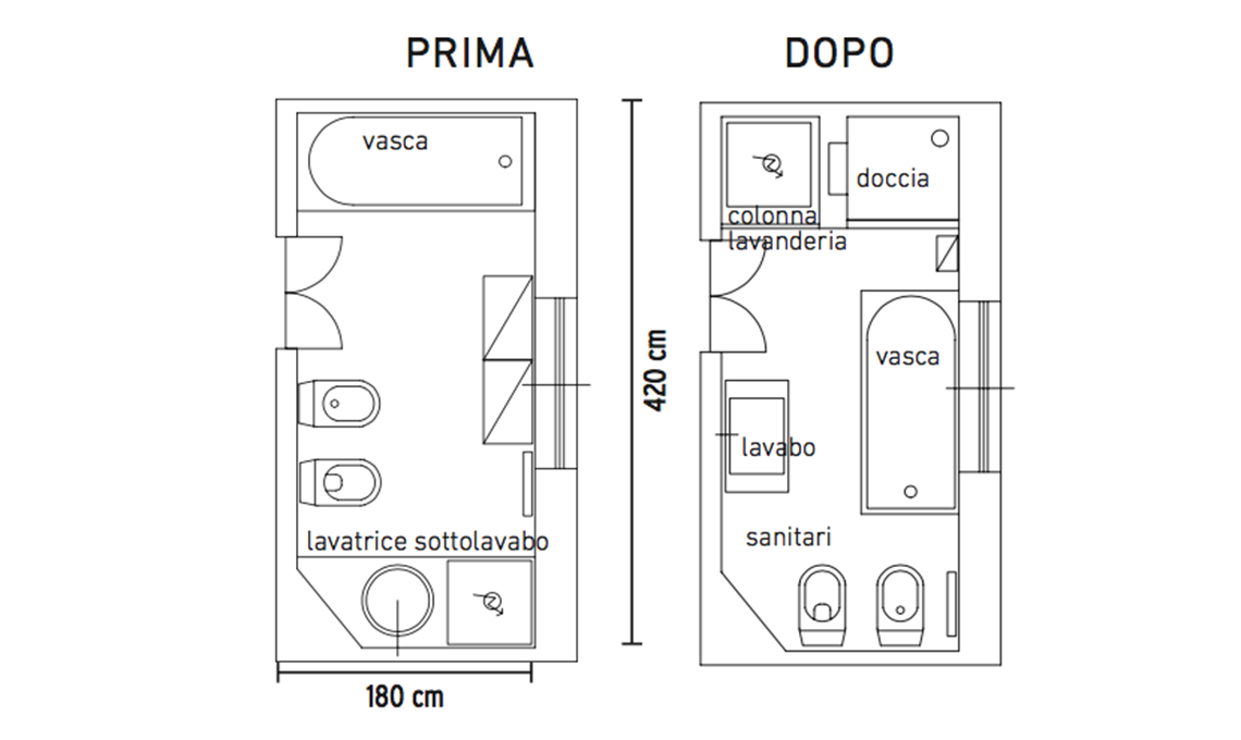Il bagno è grande ma l'attuale disposizione non mi permette di inserire l'asciugatrice. Spostando la vasca, e il lavabo, ricavo uno spazio in cui posizionare una doccia e una comoda colonna lavanderia ‘apri-e-chiudi’. Funzionalità salva, estetica pure!