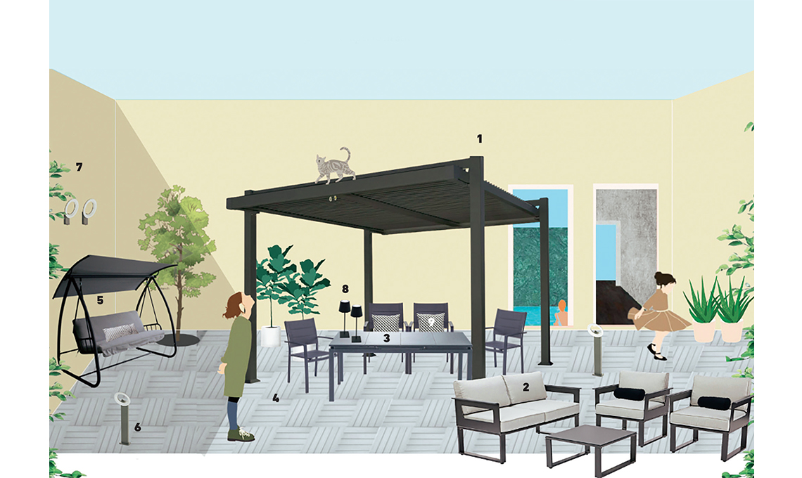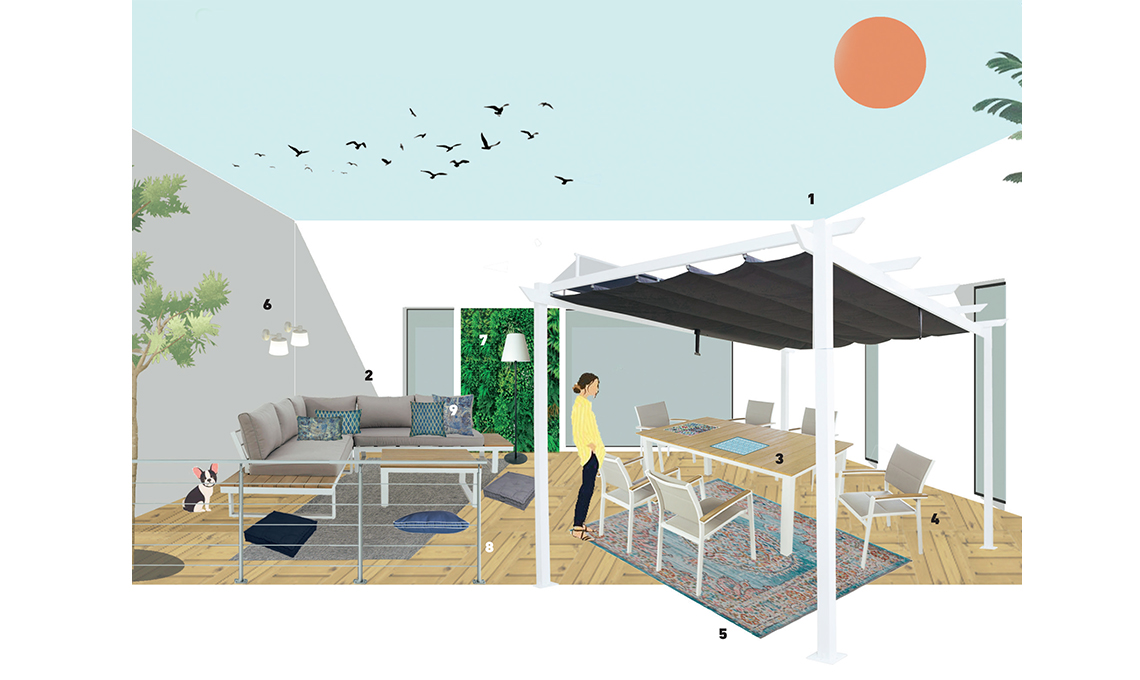 1 Pergola Omega in alluminio e poliestere. 2,83x4 m. Ref. 82232741 € 449,00. 2 Coffee set San Diego in alluminio ed eucalipto con cuscini in poliestere. Ref. 80178972 € 849. 3 Tavolo in alluminio con piano in eucalipto. L200xP100xH75 cm. Ref. 81978431. € 399 4 Sedia con braccioli.L55xP85xH55 cm. Ref. 81977191.