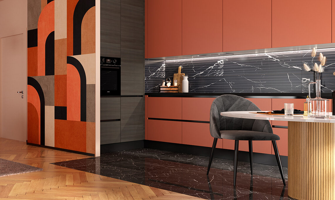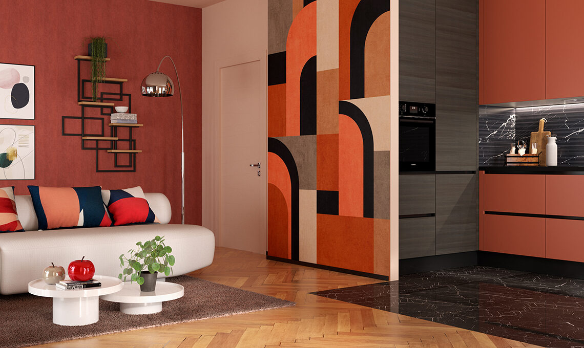 Un'unica palette colori e uno stile condiviso per living e cucina li trasformano in un progetto scenografico. Finiture e cromie creano uno stile armonioso e il colore dominante corallo i sposa perfettamente con accenti greige, bianco e nero. Il segreto è saperli ripetere nei complementi, nelle stampe e nei cuscini mixando le texture.