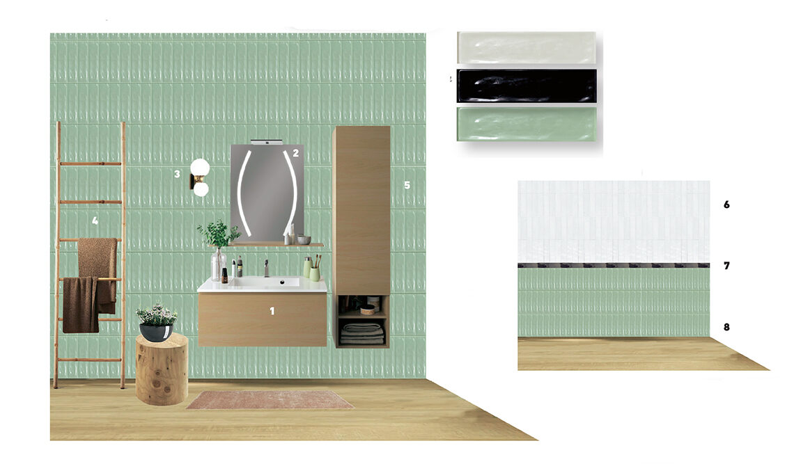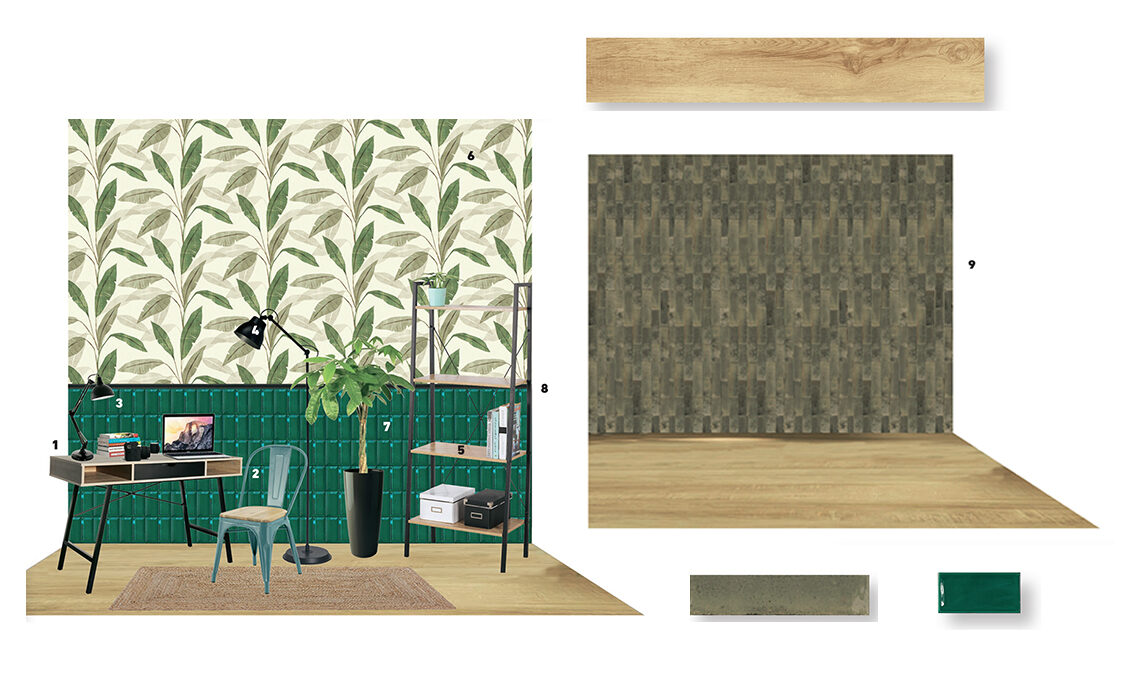 Un bagno Mono o multicolor?Si può essere creativi anche usando la stessa piastrella. Nella prima ambientazione, riveste l’intera parete con un unico colore (se vuoi dare un tocco diverso, usa uno stucco colorato per le fughe, in nuance o in leggero contrasto!), mentre nella seconda, gli elementi posati in orizzontale aggiungono movimento alla composizione. La stessa piastrella, in verticale: verde sotto e bianca sopra. Messa in orizzontale, al centro dà vita a un bordo che divide le zone. Studio con boiserie o con rivestimento a tutta parete?Un home office caratterizzato da un rivestimento di piastrelle: puoi arrivare a una altezza di 150 cm, per creare un effetto boiserie, quindi posare un profilo in metallo a dividere le due zone e applicare una carta da parati in quella superiore. Scegli sempre piastrelle di forte impatto. In alternativa, la parete è rivestita da pavimento a soffitto con una piastrella grigia dalla finitura lucida, che dà risalto alla zona. La posa verticale a correre fa sembrare più alto il locale.