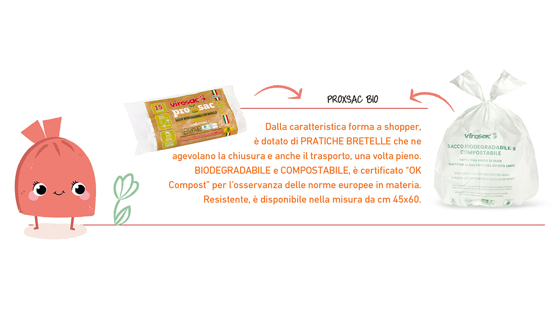 Proxsac Bio. Dalla caratteristica forma a shopper, è dotato di pratiche bretelle che ne agevolano la chiusura e anche il trasporto, una volta pieno. Biodegradabile e compostabile, è certificato “OK Compost” per l’osservanza delle norme europee in materia.