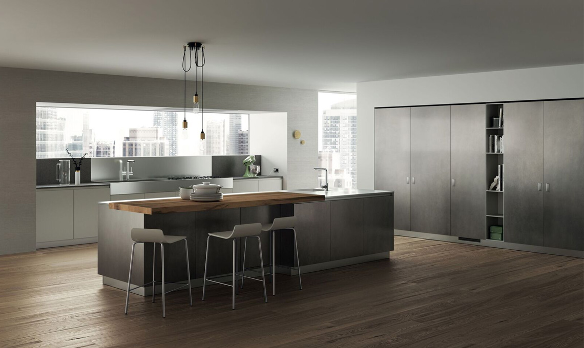Material Selection II propone l'eleganza di tre impiallacciati Noce, ideati in tre diverse nuance (Tussah, Ulster e Saxony), un legno che dona immediato calore e crea un'atmosfera intima mitigata dalla raffinatezza metallica delle quattro nuance di Laccato effetto ossidato per modelli come Mood, Liberamente, Foodshelf e Motus che si ispirano all'urban style tingendo la cucina di colori come Steel, Copper, Brass e Aluminium: soluzioni affascinanti dal gusto minimal ma accogliente che si sposano perfettamente con gli open space.