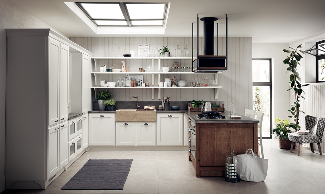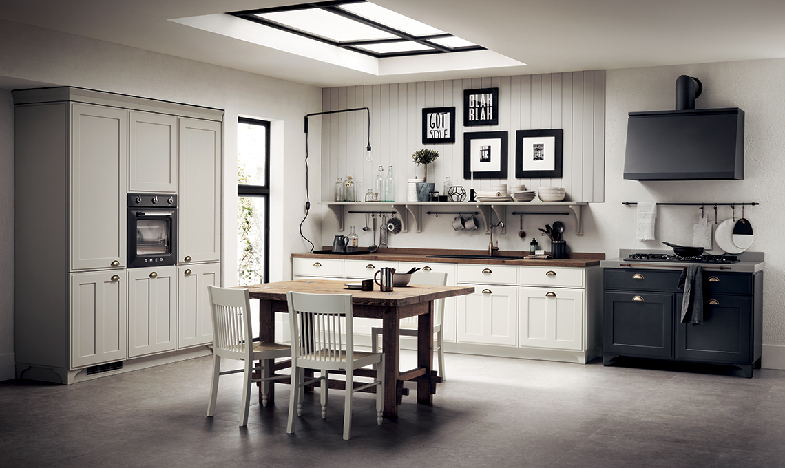 La collezione comprende blocchi lavaggio e cottura d’ispirazione industriale, le maniglie invecchiate, le credenze e le madie che evocano quella tradizione che tanto scalda il cuore.