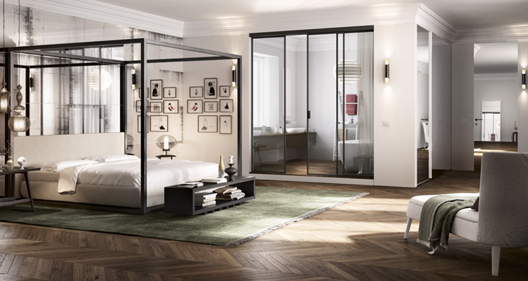 Il vetro è protagonista di Visio, la soluzione con sistema di scorrimento a parete e a soffitto. Disponibile in 18 finiture – extrachiaro, trasparente e riflettente – il cristallo temperato è di altissima qualità e spesso 8 mm. Un grande impatto visivo che arricchisce l'ambiente di un tocco glamour.