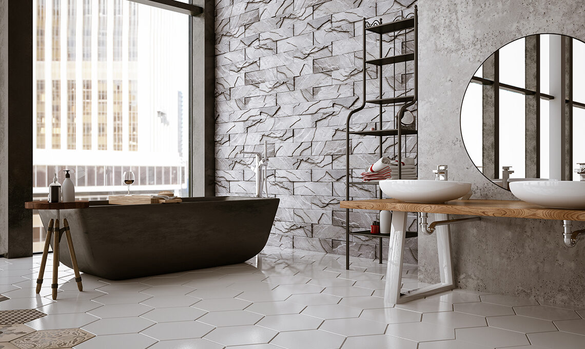La stuccatura colorata valorizza le piastrelle diventando un vero particolare di design oltre che dettaglio tecnico.