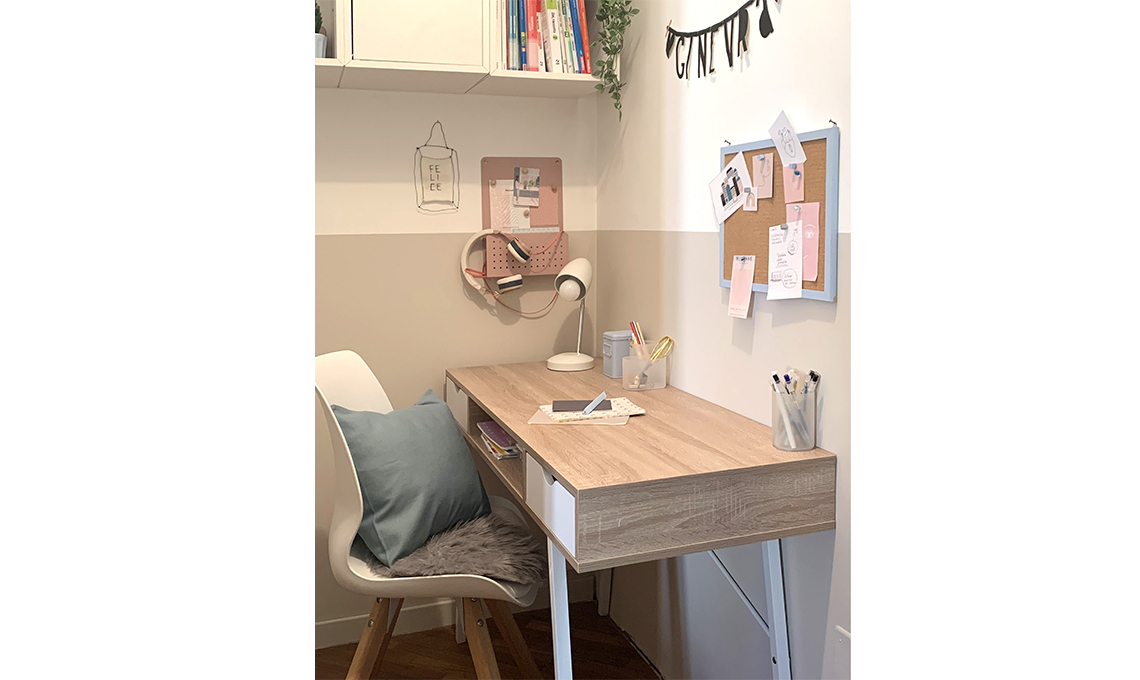 Con lo stesso smalto nelle tonalità B7.10.59 e T0.10.70 si è divertita a personalizzare oggetti e complementi, oltre a creare una decorazione aggiuntiva sopra il termosifone. Quella che prima era la camera matrimoniale adesso è il regno di Ginevra: uno spazio luminoso romantico e  adatto a lei, in cui studiare, accogliere le amiche e rilassarsi