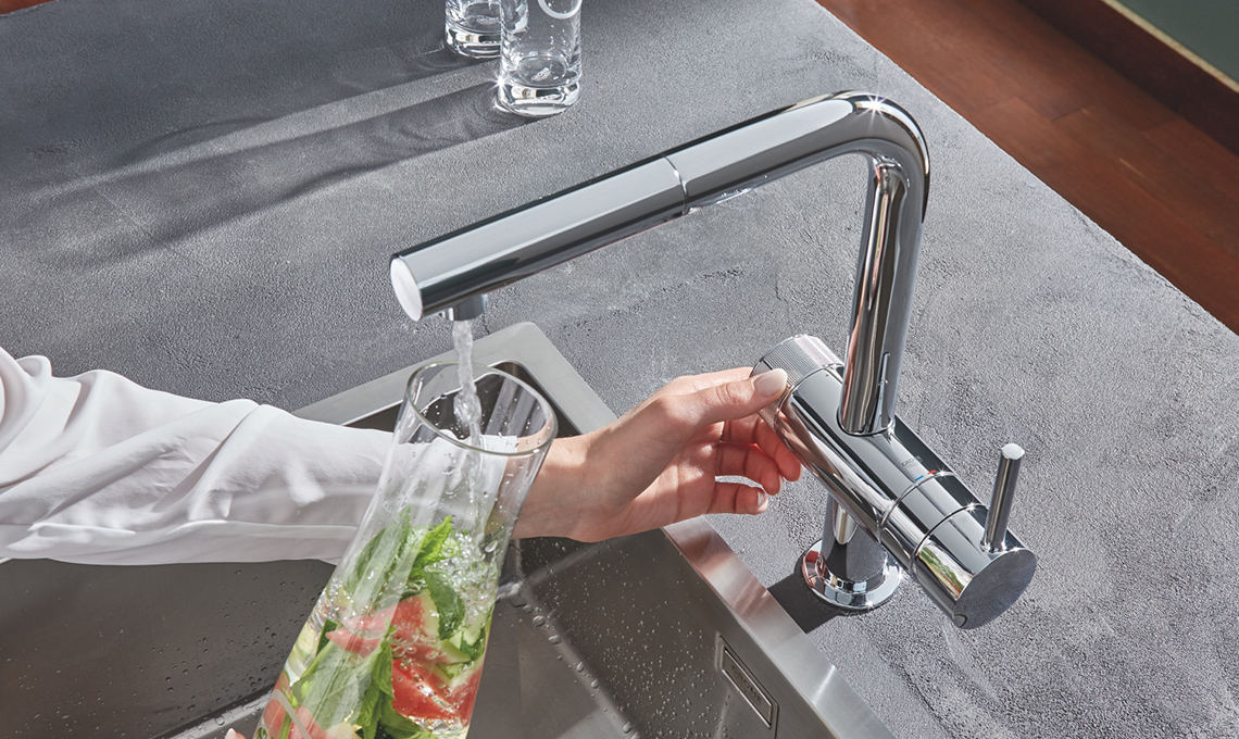 Dotati dell’esclusiva tecnologia di filtrazione e di un rubinetto 2in1 i sistemi Grohe Blue aggiungono valore alla comune acqua del rubinetto, eliminando tutte le sostanze che possono alterarne il sapore