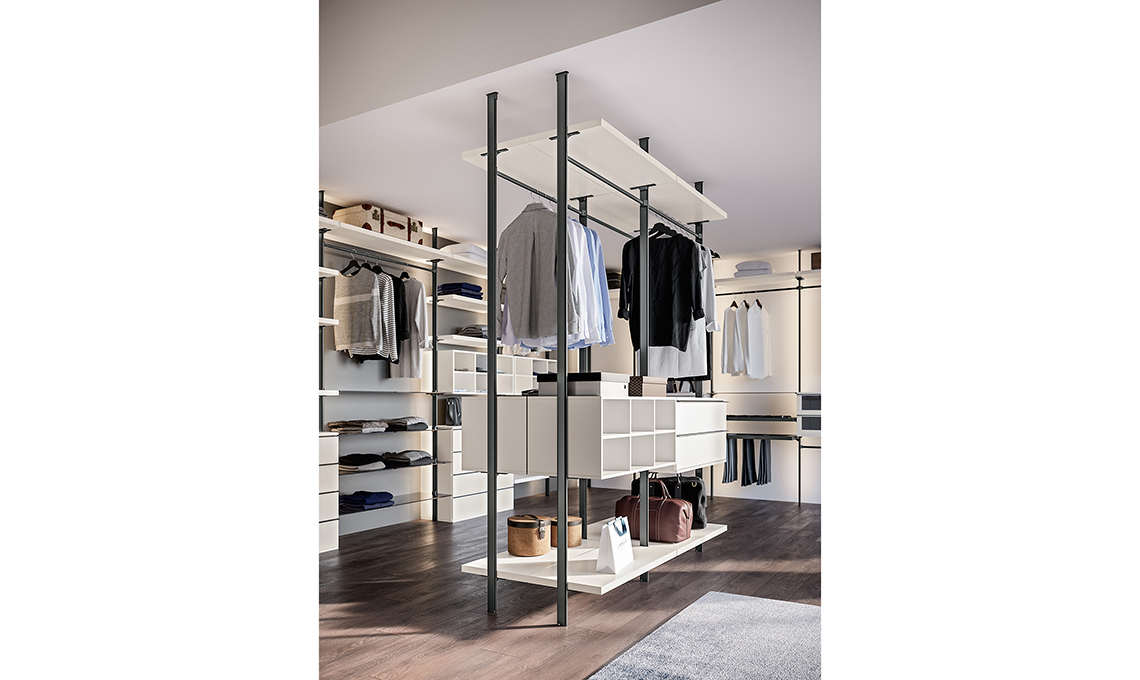 La collezione 2020 comprende: cabine armadio a spalle, a boiserie e a montanti. Il modello a spalle si caratterizza per la parete attrezzata, ricchissima di accessori e tantissime finiture. La cabina armadio a boiserie, attraverso la copertura delle pareti con pannelli di legno, dona funzionalità e praticità. La cabina a montanti, con i suoi elementi metallici, conferisce elasticità e massima libertà nelle composizioni.