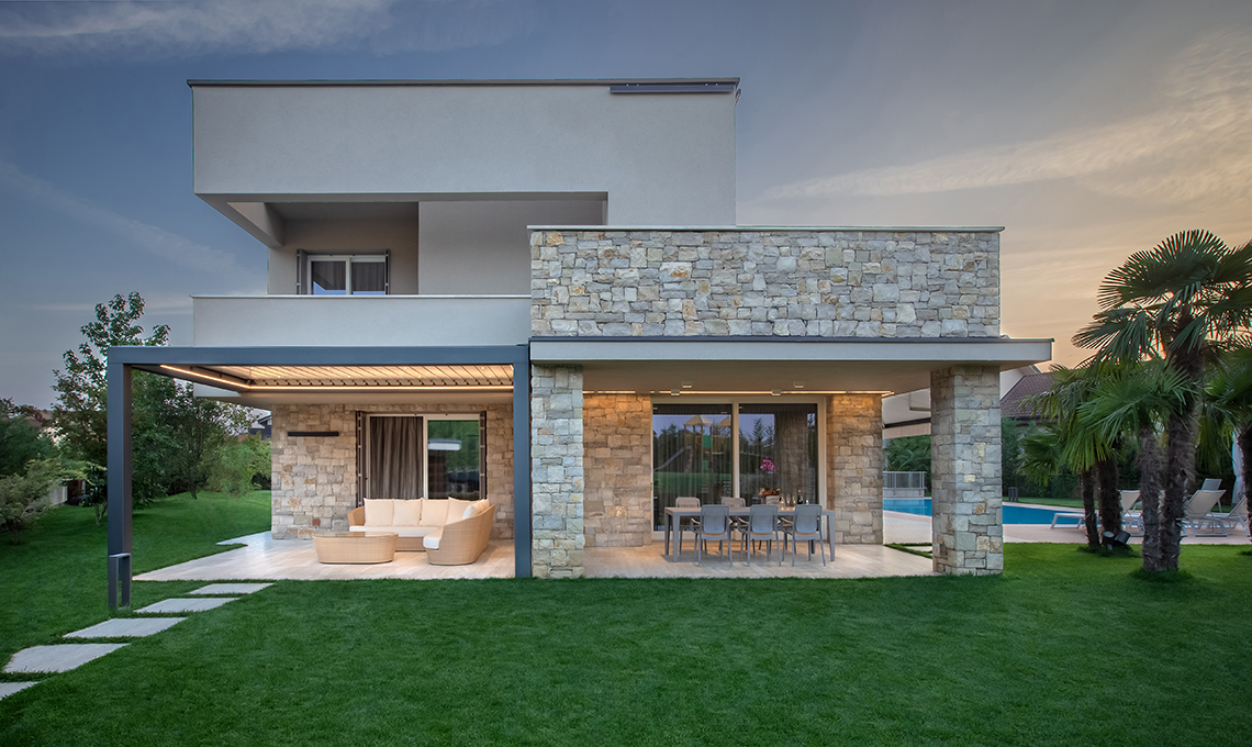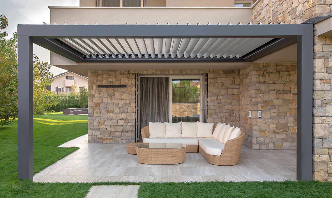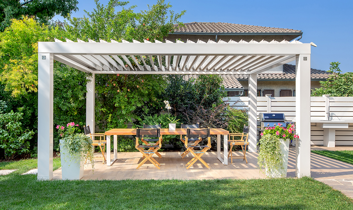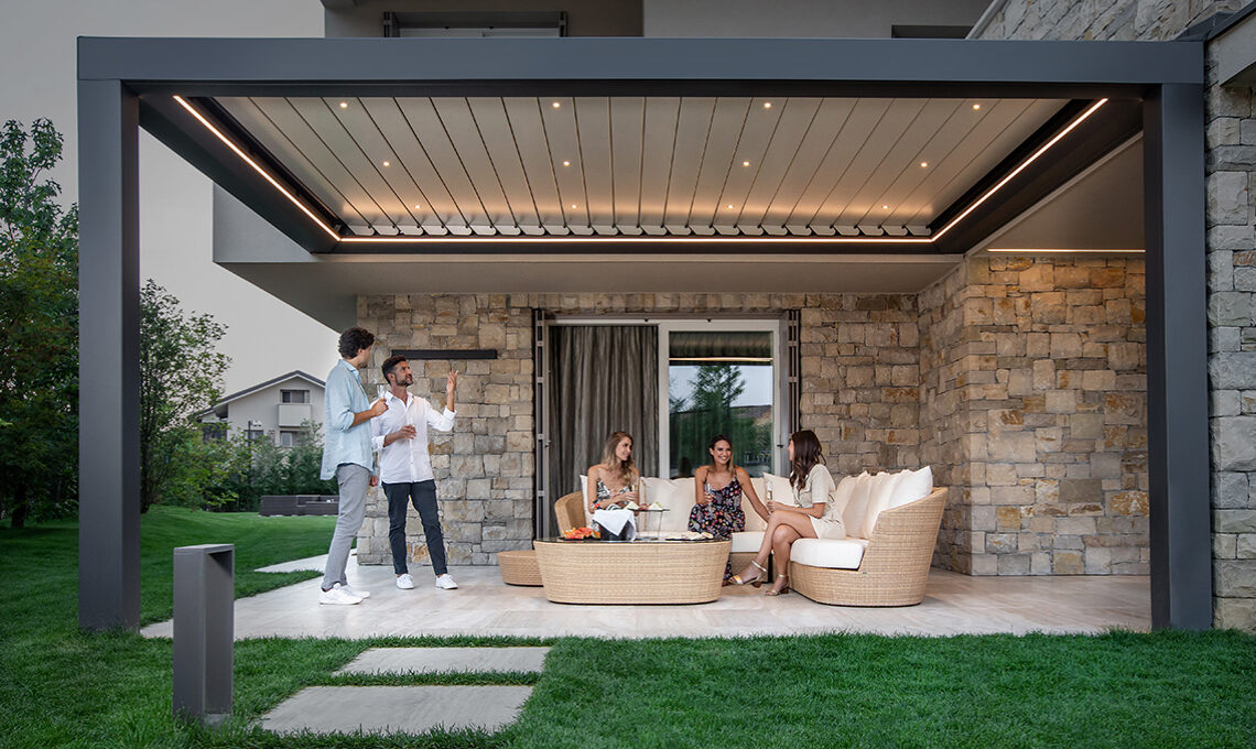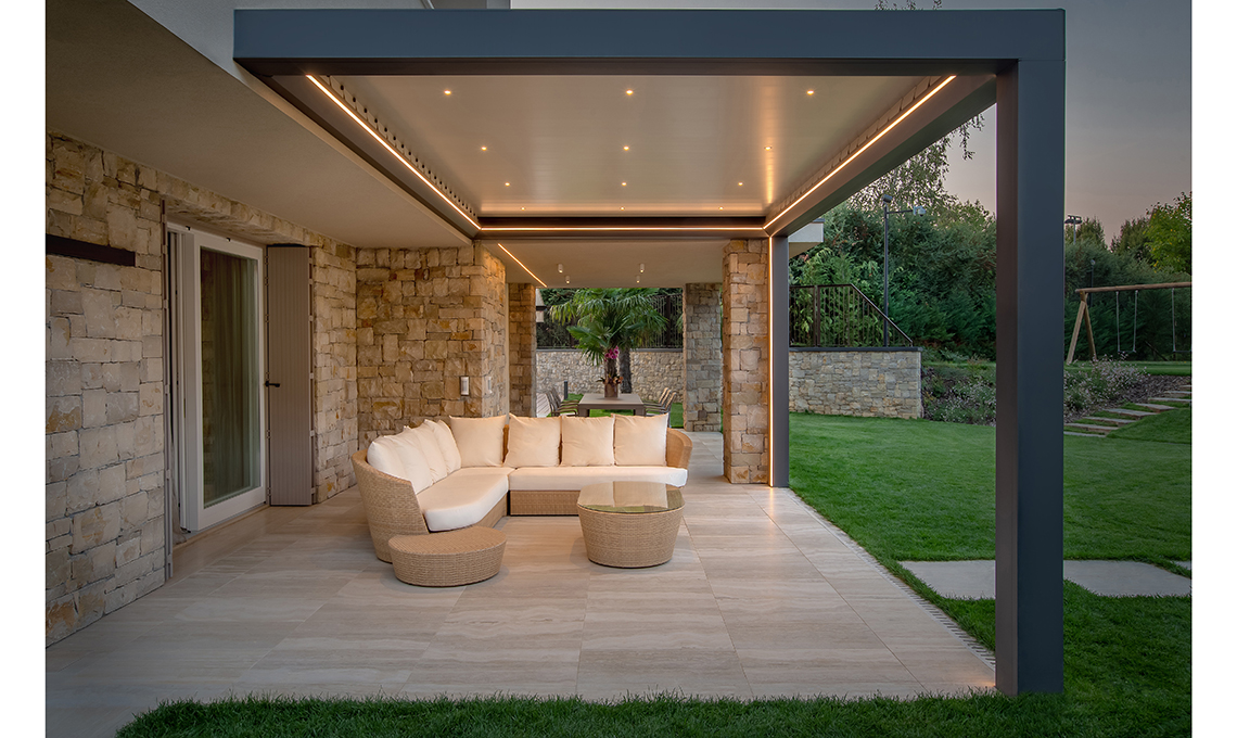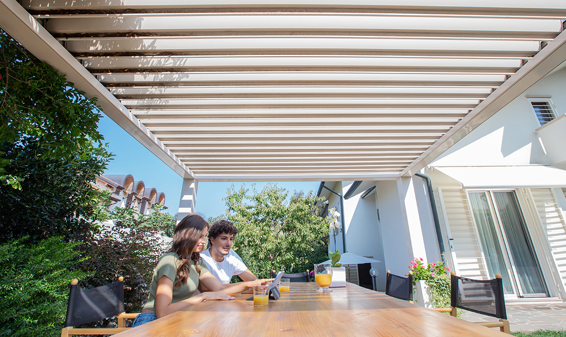 Connotata dal rigore delle forme contemporanee che incorniciano il panorama e da un’anima hi-tech, ha una copertura smart dotata di lamelle orientabili da 0° a 140° gestibili da telecomando, che garantisce un microclima on demand adattabile a ogni esigenza, dalla totale o parziale protezione dal sole alla climatizzazione ottimale, fino al sicuro riparo dalla pioggia. Vuoi rendere la pergola ancora più funzionale? Basta integrare le luci a led per goderne il fascino anche nelle ore serali e dotarla del sensore opzionale, per comandare automaticamente la chiusura delle lamelle in caso di pioggia, e del sensore di temperatura che, in caso di gelo o neve, apre le lame.