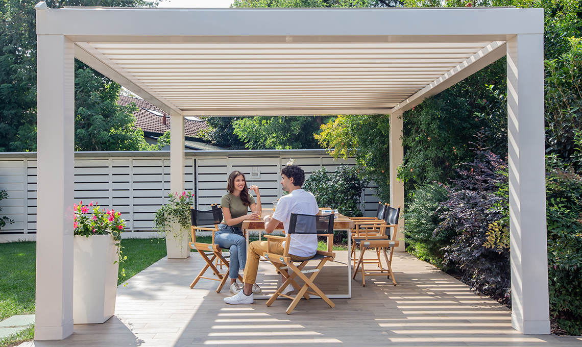 Perfetta per mettere in dialogo diretto l’interno e l’esterno della casa, crea una stanza outdoor sempre fruibile, anche nelle giornate meno calde e in condizioni di pioggia. Il suo design ricercato non ha nulla da invidiare agli ambienti indoor ed è totalmente custom-made, così potrai definirne il look con le finiture che preferisci o accessoriarne la struttura con elementi capaci di personalizzarla: dal colore della verniciatura a basso impatto ambientale della struttura alle luci a Led dimmerabili integrate nelle lamelle o incorporate nelle gronde e piantane, fino alle pareti mobili realizzabili con chiusure scorrevoli tuttovetro o con frangisole (come nella foto nella gallery).