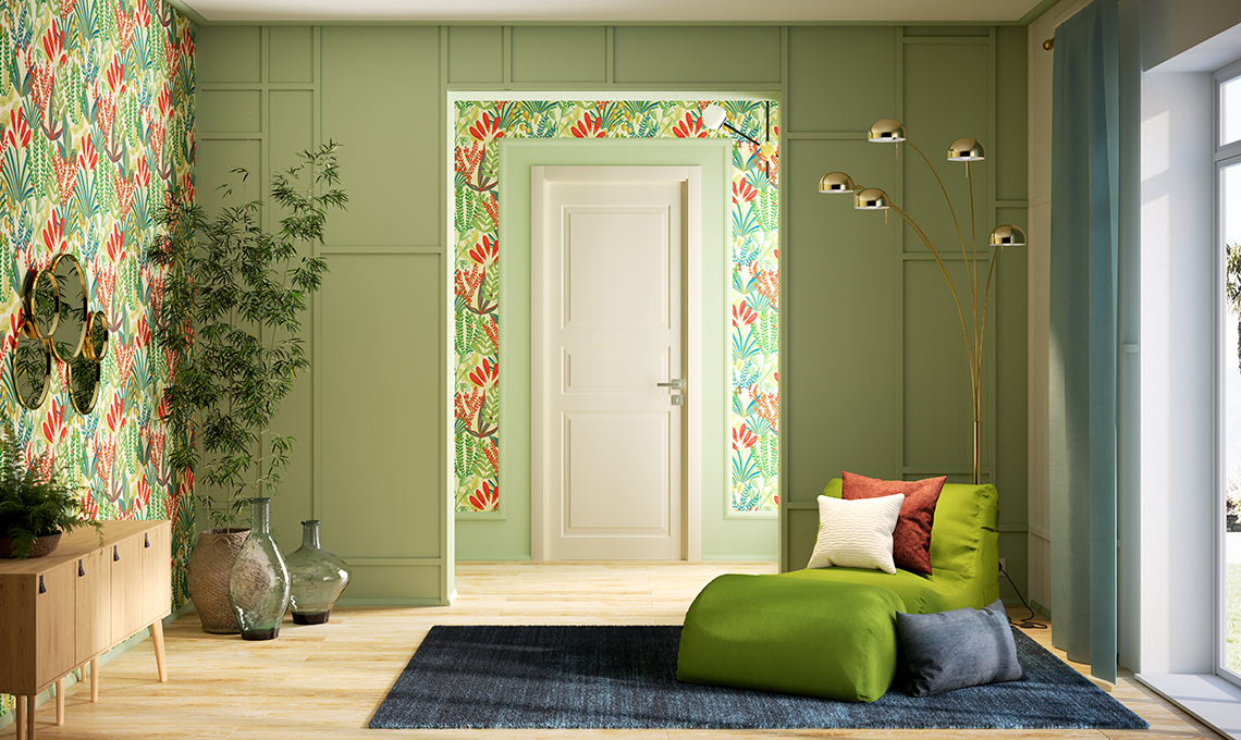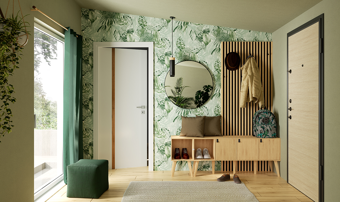 Una soluzione per trasformare l'ingresso in uno spazio in più, funzionale e pieno di carattere. Le idee di arredo sono mirate a ottimizzare lo spazio disponibile, con la valorizzazione di un’estetica di stampo green. La carta da parati, con vistose foglie tropicali, riveste le pareti della stanza e i mobili sono in legno chiaro. Fin dall’ingresso, colori e materiali ispirati dallo stile jungle trasmettono un messaggio chiaro: si apre un’oasi verde dove chiudere alle spalle il caos e la frenesia quotidiane. Per completare l’effetto dell’ambientazione jungle, basta aggiungere una tenda verde che filtra la luce della finestra e riunire un gruppo di piante da posizionare a terra, su mensole o sgabelli di legno.