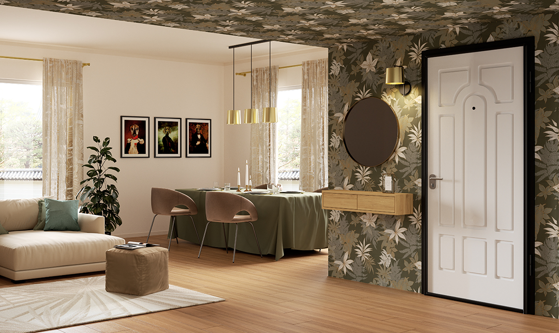 Si può delimitare l’entrata dipingendo o tappezzando l’area attorno alla porta d'ingresso. Il motivo foliage della carta da parati che incornicia la porta si allunga fino a rivestire una porzione di soffitto e crea un effetto scatola dalla grande carica estetica. Se ingresso e soggiorno sono open space, non bisogna cadere nella trappola del total look beige per non banalizzarlo. Largo quindi a colori, differenti texture e motivi decorativi che danno vivacità al living. Pochi elementi valorizzare l'ingresso minimal ma sofisticato. La mensola con cassetti in rovere naturale, un grande specchio rotondo e un pouf comodo valorizzano l’angolo ingresso senza appesantirlo. Il compito di mantenere il senso di continuità tra le zone del living è affidato al pavimento in grés porcellanato effetto legno.