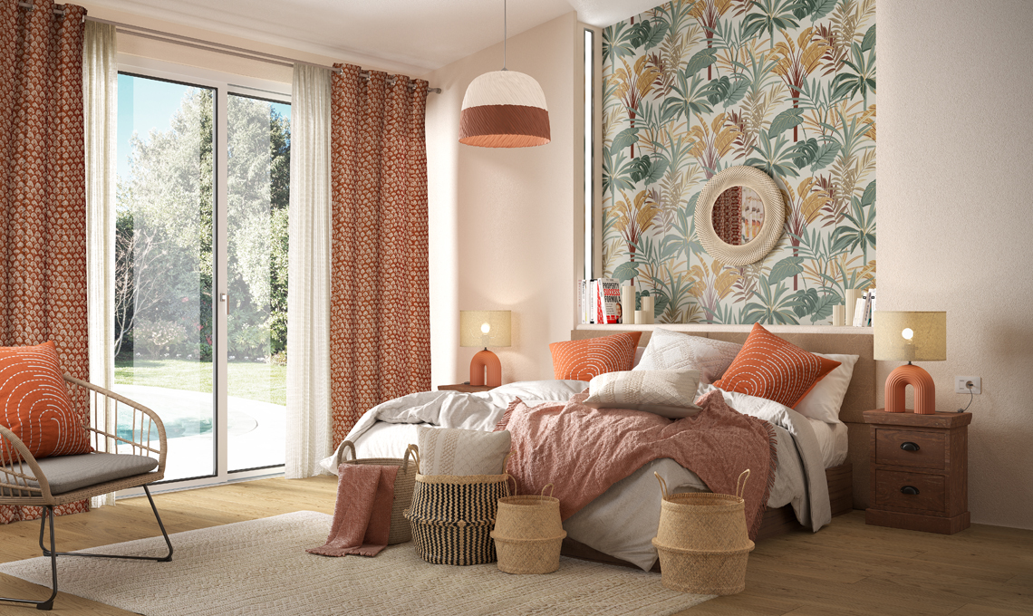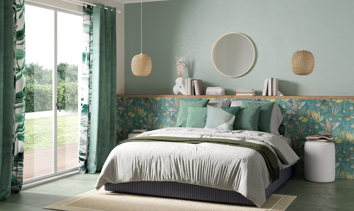 Qui troviamo una carta da parati che riproduce l'effetto di un fitto fogliame che riveste la parete dietro il letto, servendo sia da comodino che da mensola per libri e oggetti decorativi. La palette di colori ruota attorno al verde, al bianco e al beige, con l'utilizzo di materiali naturali come il legno, la corda e il bambù, creando così un ambiente accogliente e rilassante.