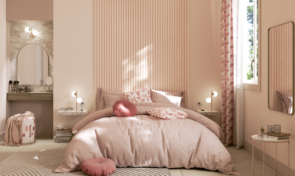 Qui l'attenzione si concentra sulla testiera del letto. Questa è stata realizzata con listelli di legno che si estendono fino al soffitto e sono stati dipinti con la stessa nuance rosa delle pareti. L'effetto è straordinariamente elegante, con tocchi dorati, linee curve e superfici specchiate che aggiungono un tocco di lusso.