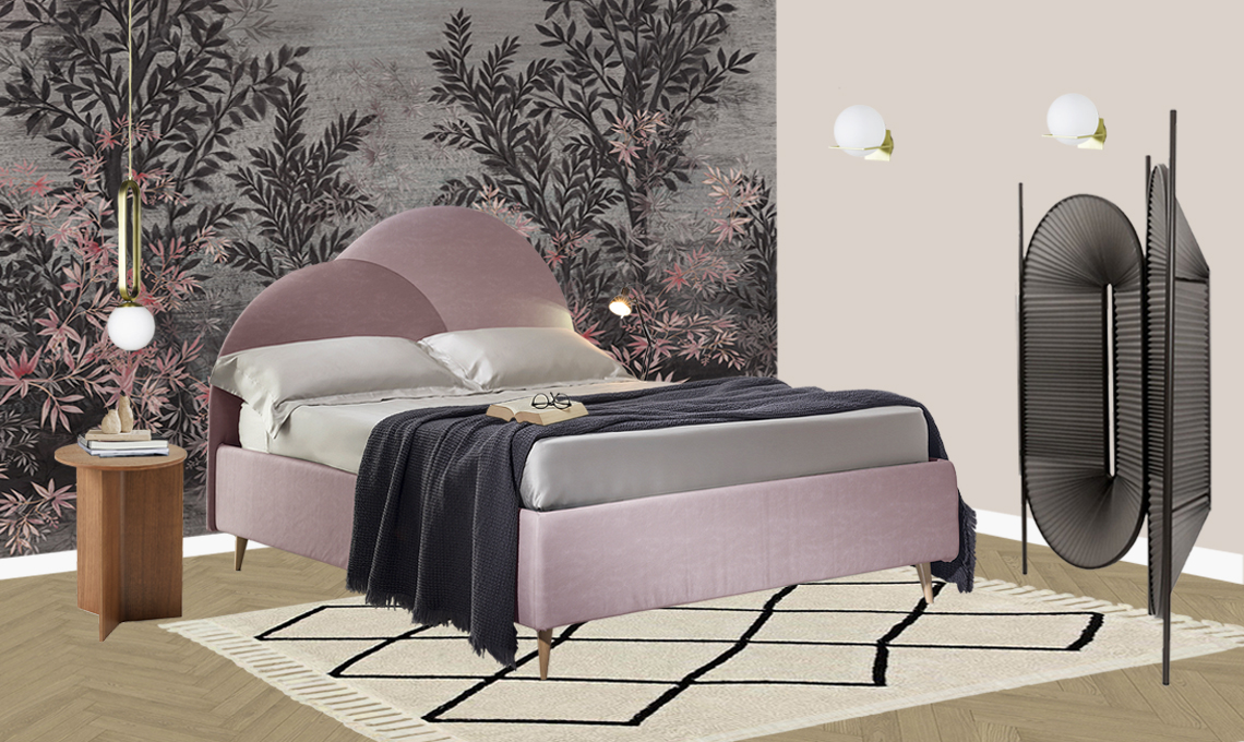 L'ambientazione creata con il letto Abbraccio [PerDormire]: carta da parati floreale Ercolano [Inkiostro Bianco], tavolino in legno di noce [HAY], lampada a sospensione Cime e appliques in ottone Gin [Eno Studio], tappeto Bereber [Lorena Canals], paravento Minima Moralia in metallo verniciato color antracite [Dante Goods and Bads].