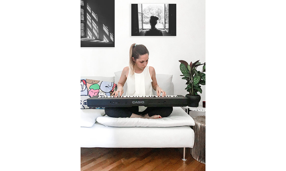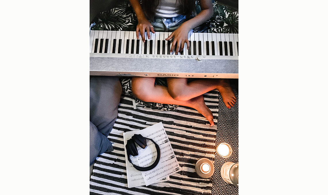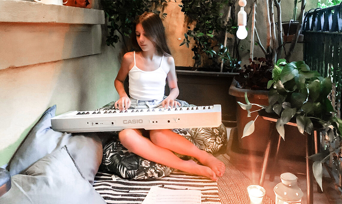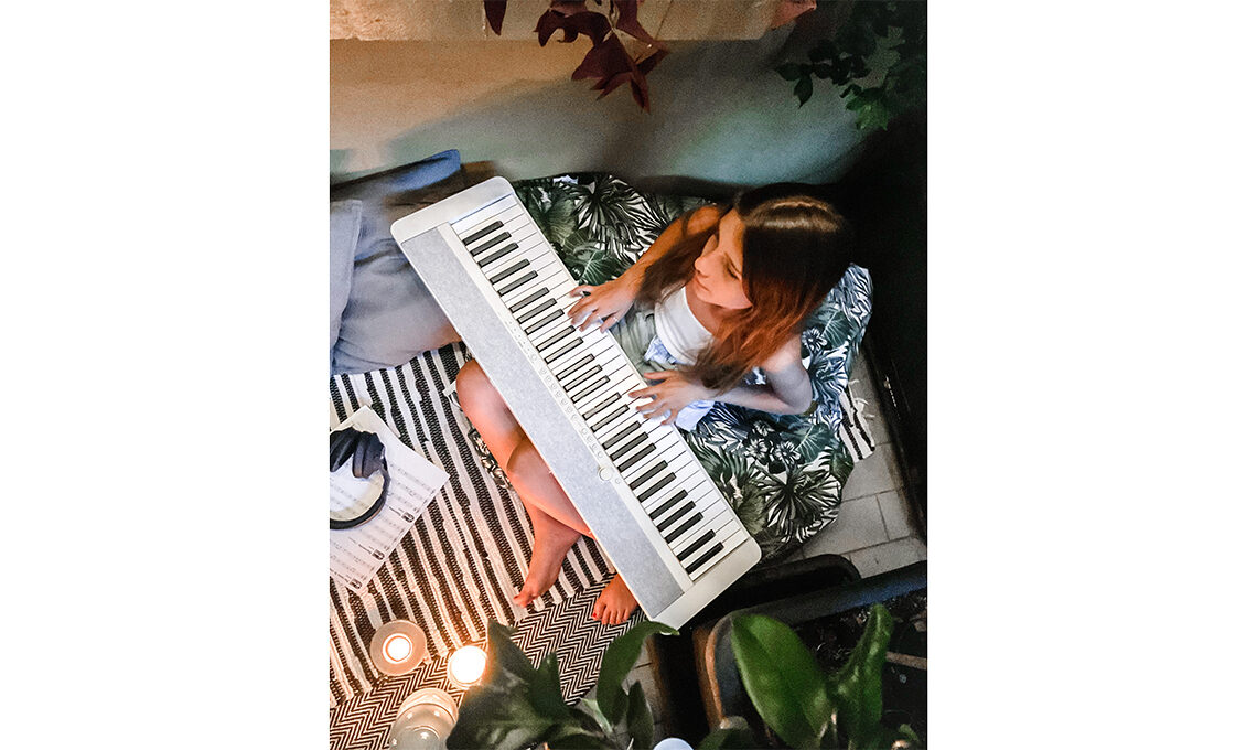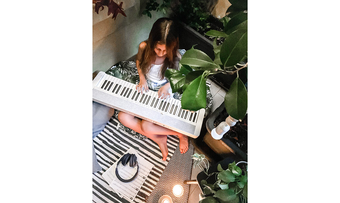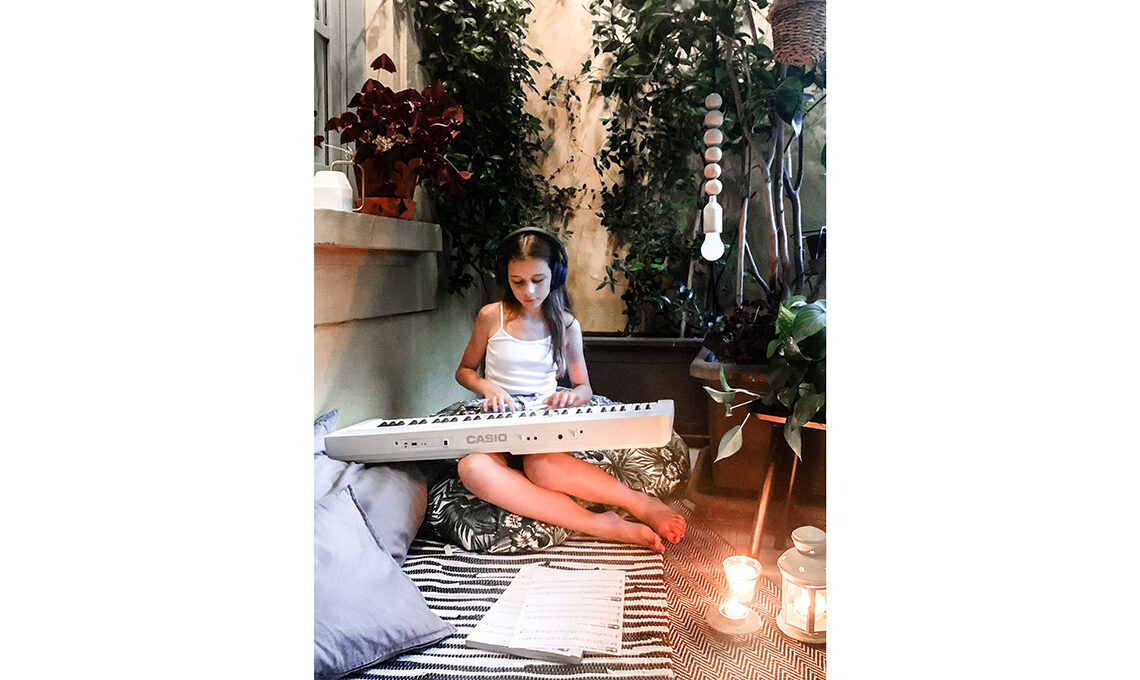 Il terrazzo ormai è il regno di Ginevra e grazie a un piccolo restyling si è trasformato per ospitare le sue sessioni musicali... anche serali!... e per non disturbare i vicini, bastano un paio di cuffie da collegare alla tastiera. Perché con la Casiotone potete suonare quando e dove volete: sul divano, in un momento di relax in camera da letto... e sul terrazzo!