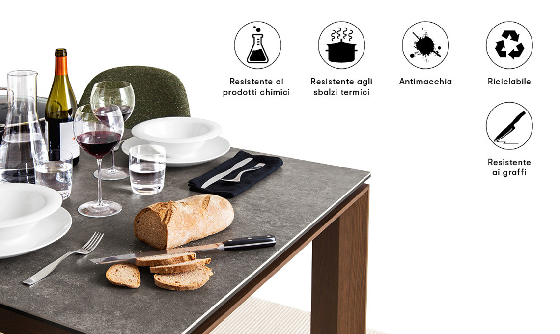 Adatta per tutte le esigenze e raffinata nel look, la ceramica è il tuo alleato in casa per resistere all'esuberanza di grandi e piccini. Via libera ai lavoretti dei bimbi e al fai-da-te senza la preoccupazione di graffi e ammaccature: i piani in ceramica Calligaris sfruttano le potenzialità del vetro e sono per questo più resistenti che mai. Ma non finisce qui: i piani realizzati in questo materiale sono impermeabili e non assorbono le macchie, rendendo la pulizia facile e veloce, senza il bisogno di prodotti specifici. Decisamente un materiale pronto ad affrontare tutti i tuoi esperimenti in cucina, le feste di compleanno dei ragazzi o i più scatenati ritrovi dopo la partita.