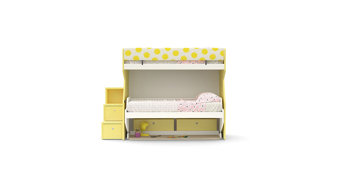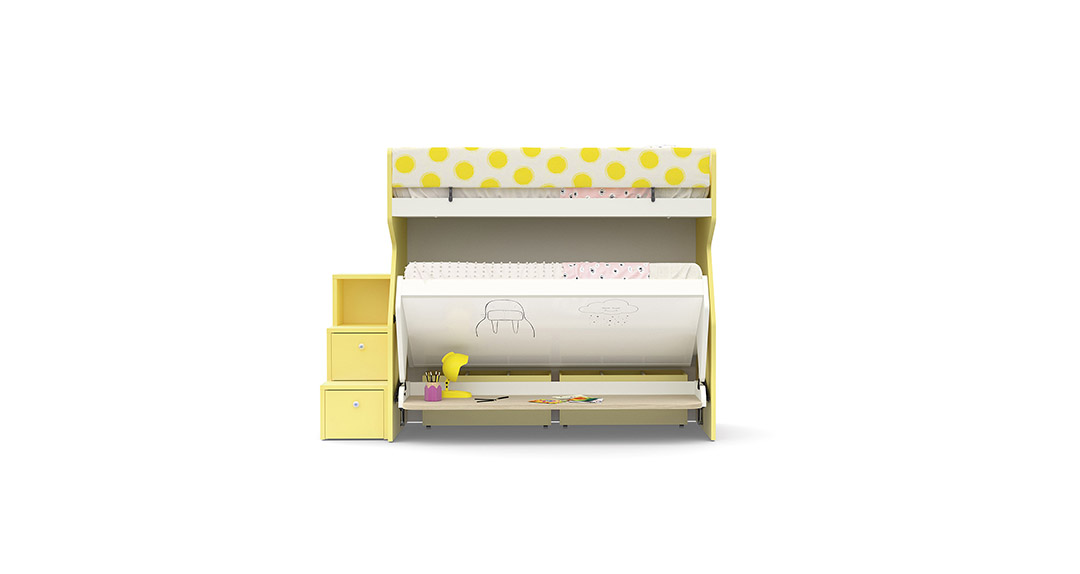 Di giorno si può disegnare e giocare insieme, mentre quando è ora di andare a dormire, il meccanismo fa scivolare in basso lo scrittoio e il secondo letto compare, pronto per accogliere l'ospite.