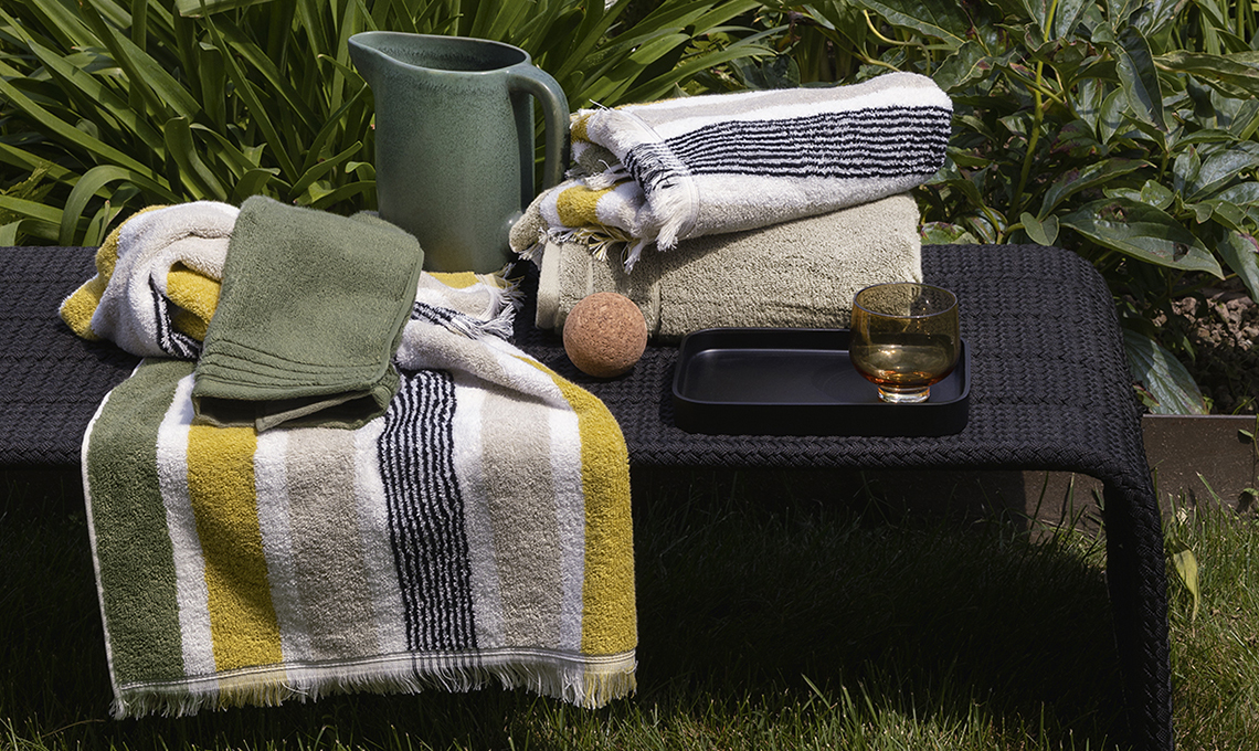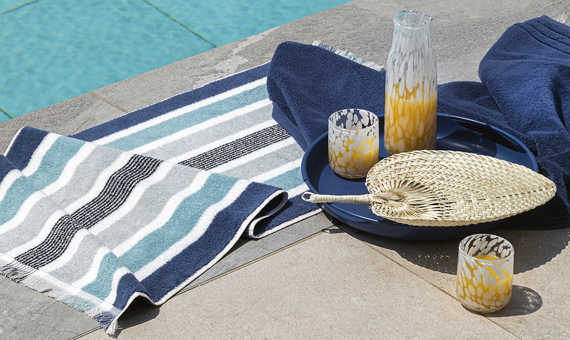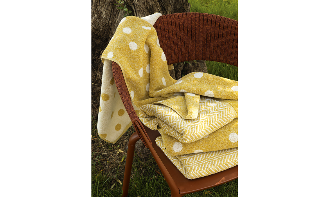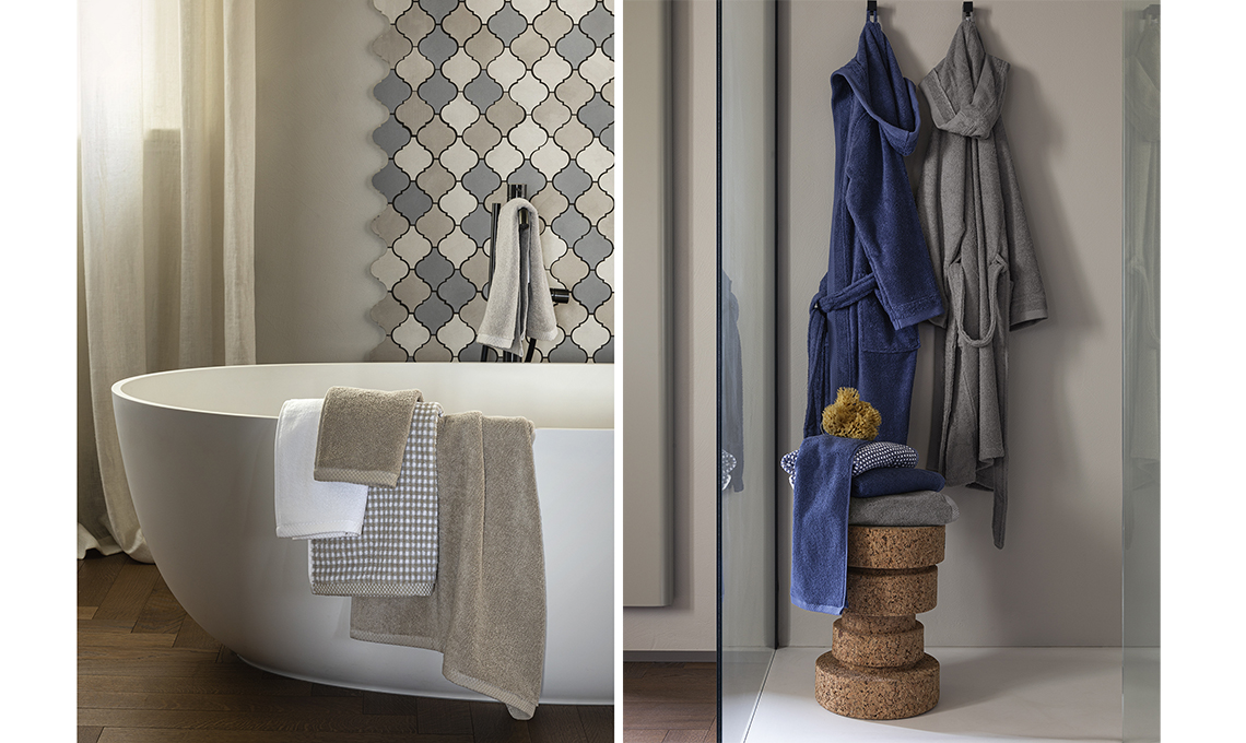 Gradazioni - non solo tessili per il letto, la collezione di Fazzini Primavera Estate 2024 comprende anche spugne che si ispirano alle estati italiane tra righe, pois e tinte unite.