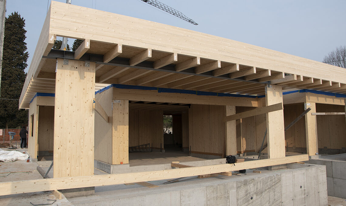 Resiste al fuoco perché il legno lamellare brucia più lentamente di quanto non fonda il ferro del cemento armato. La struttura in legno è interamente portante e quindi l’incendio di una parete non provoca il collasso dell’intera struttura.