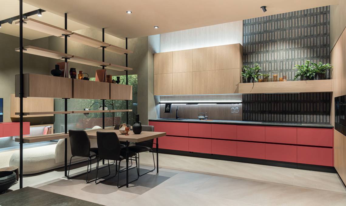 Young di Stosa si inserisce in spazi anticonvenzionali in cui le matericità si fondono, gli elementi si mescolano, le funzioni si moltiplicano: la zona living si armonizza con la cucina grazie a librerie e arredi che riprendono lo stesso colore garantendo un risultato visivamente fluido