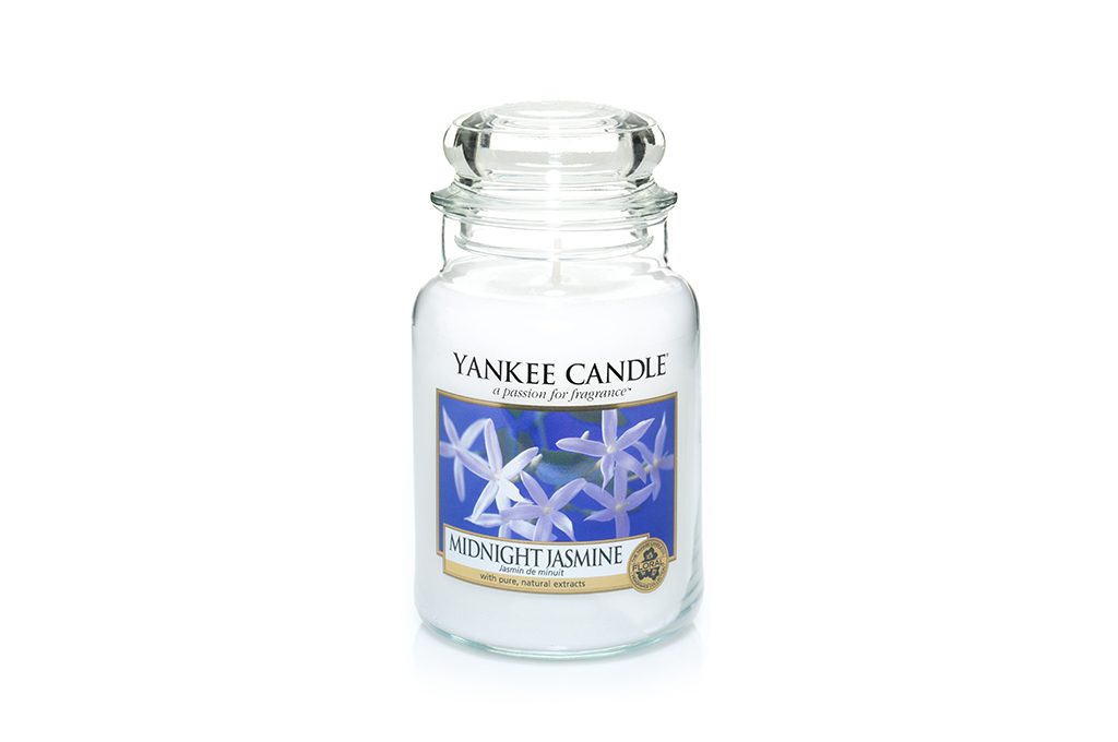 Midnight Jasmine ha il profumo seducente e intenso del gelsomino acquatico, del caprifoglio dolce, del neroli e dei fiori di mandarino [Yankee Candle, giara grande € 27,99].
