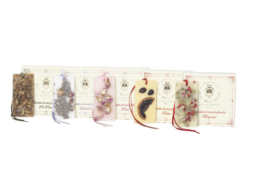 Tavolette di cera profumate, da appendere negli armadi o riporre nei cassetti, ottenute dalla macerazione di bacche, foglie e petali di fiori tipici dei colli fiorentini. Disponibili in 5 profumazioni: lavanda, pot-pourri, rosa, melograno e arancia [Santa Maria Novella, € 15].