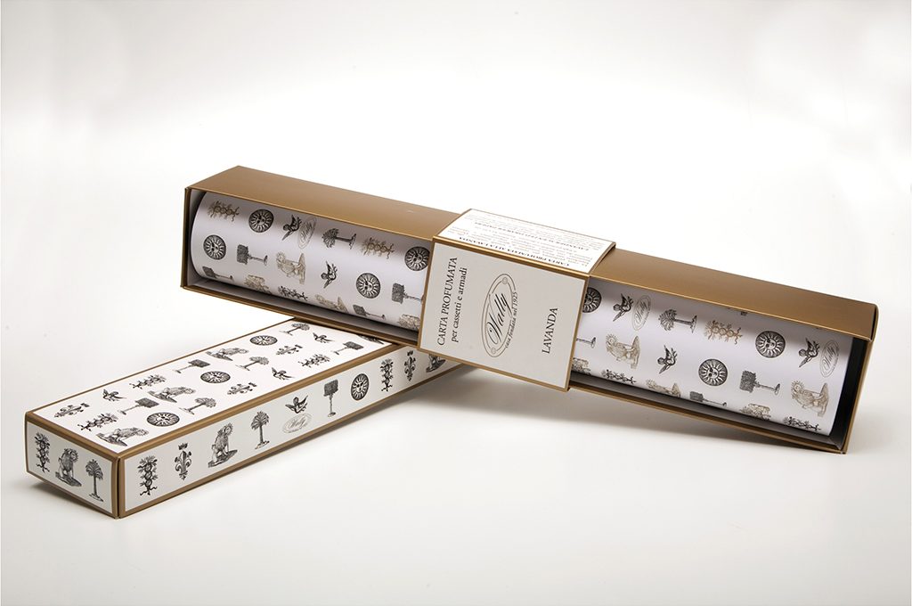 Carta profumata per cassetti e armadi alla lavanda, decorata con simboli tradizionali esoterici, impreziosisce e valorizza l'interno dei mobili donando una fresca sensazione di piacere e benessere [Wally 1925, confezione da 6 fogli € 16,90].